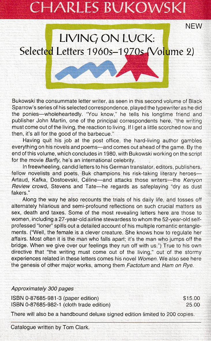 Published by Black Sparrow Press in 1995, this is the First Edition Trade Hardcover edition of Living on Luck: Selected Letters 1960s-1970s: Volume II.