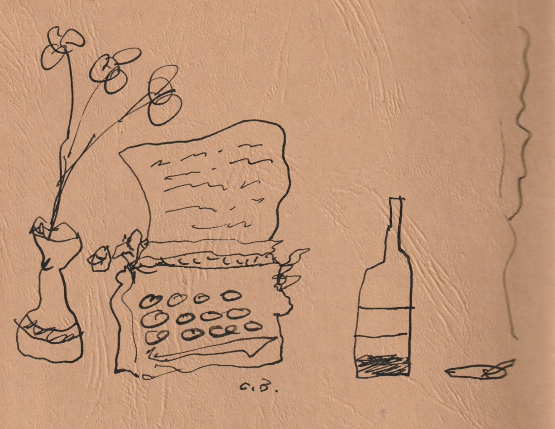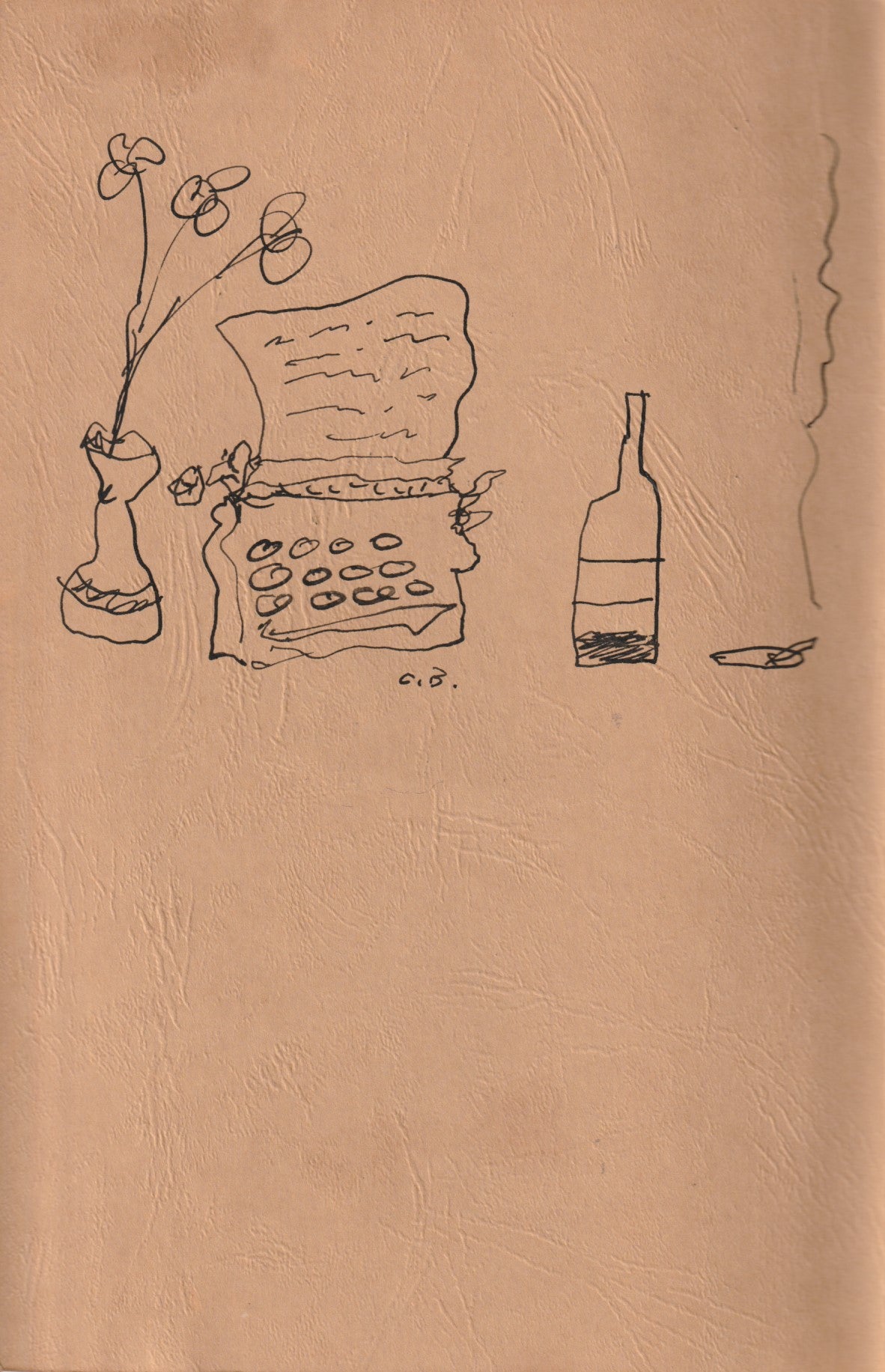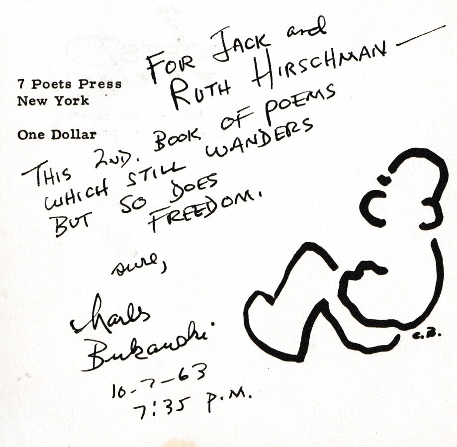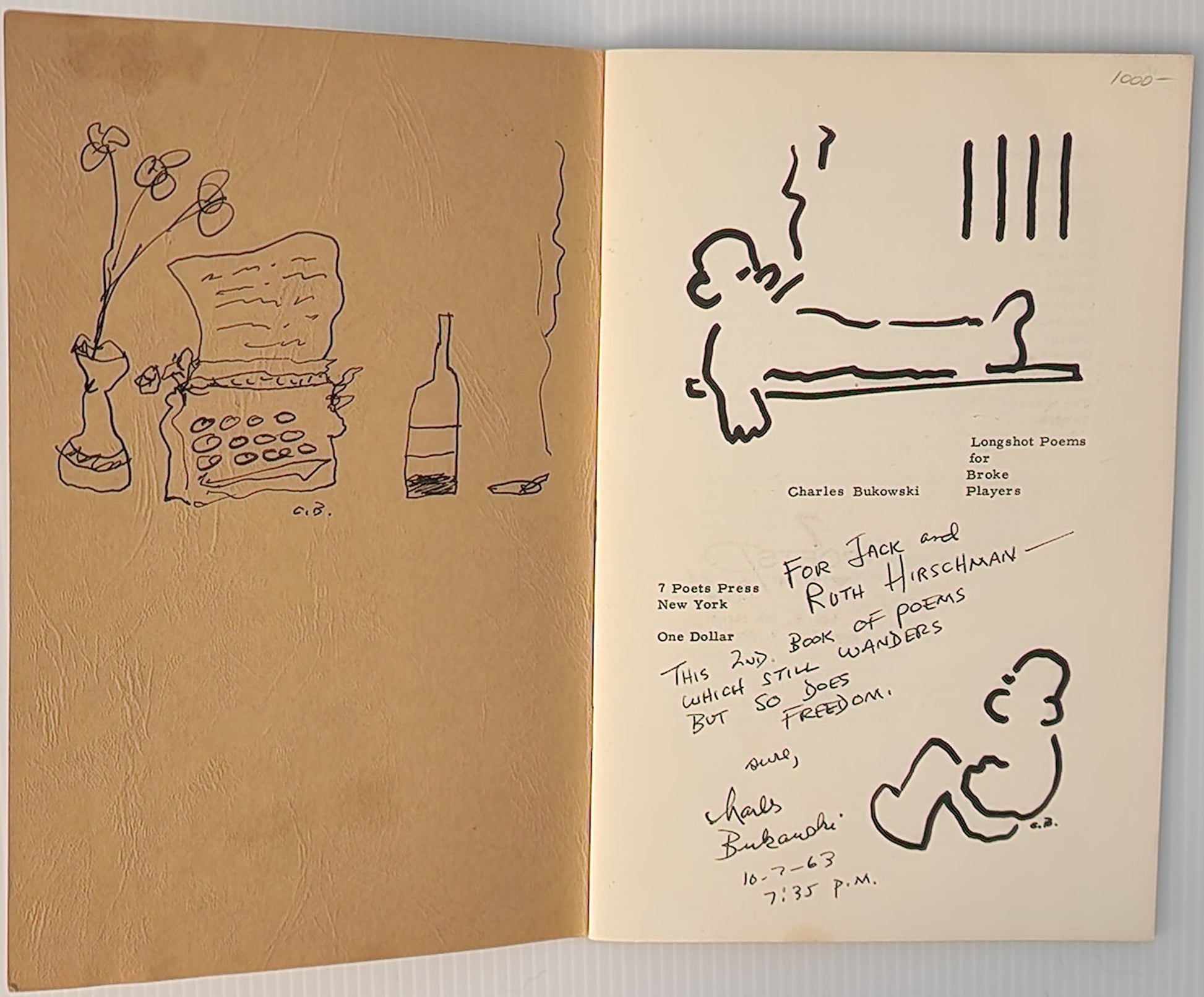 This copy is inscribed to Jack and Ruth Hirschman with the date and time. Bukowski also added a detailed drawing of a vase with flowers, a typewriter, a bottle, and an ashtray with burning cigarette.