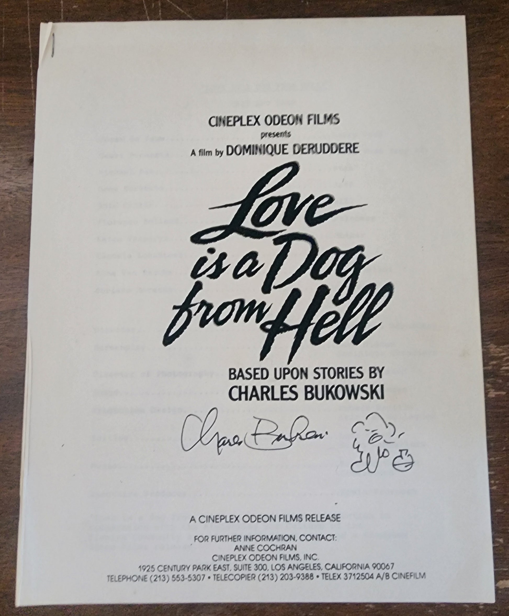 This copy is signed by Charles Bukowski on title page of the film synopsis part of the kit.
