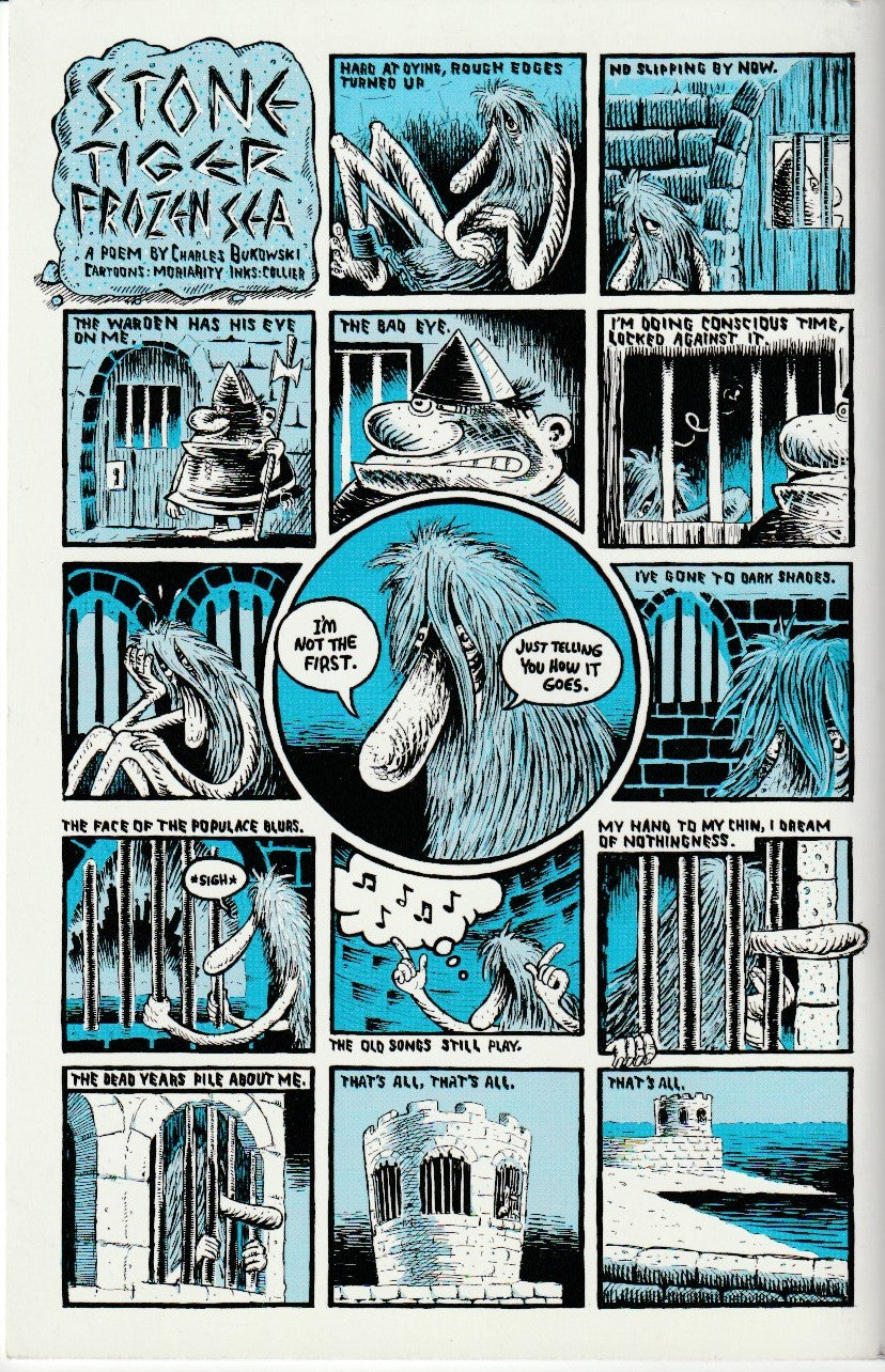 Published in 2013, Mineshaft 29 features the poem “Stone Tiger Frozen Sea” by Charles Bukowski. The poem is illustrated by Pat Moriarity and David Collier.