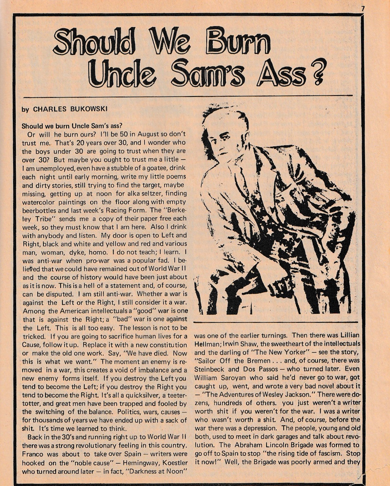 Bukowski does not disappoint. His classic treatise “Should We Burn Uncle Sam's Ass?” smacks of wisdom and experience that people under 30 simply didn’t have. His basic sentiment is, If you’re going to have a revolution, do it right and don’t get fooled again.