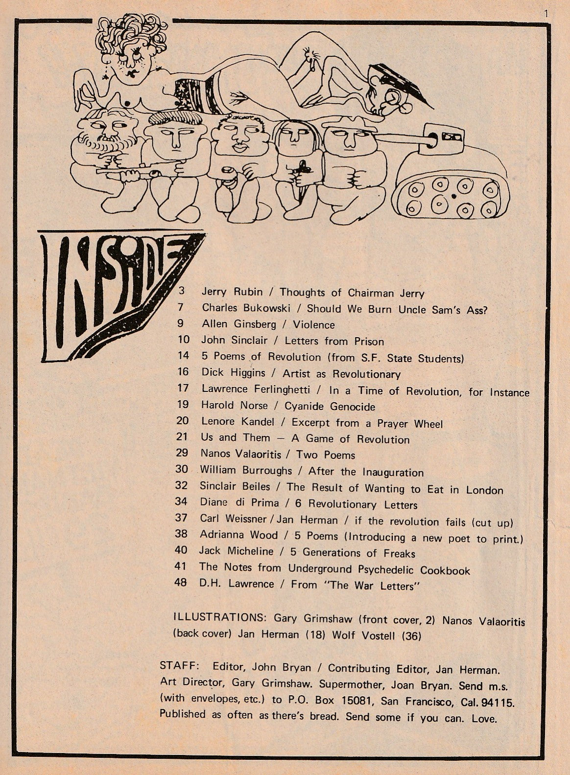 Contributors include Jerry Rubin, Allen Ginsberg, William Burroughs, Carl Weissner, Jack Micheline, John Sinclair, D.H. Larwence, Lawrence Ferlinghetti, Harold Norse, Lenore Kandel, Dick Higgins, Nanos Valaoritis, Sinclair Beiles, Diane di Prima,, Jan Herman and Adrianna Wood.