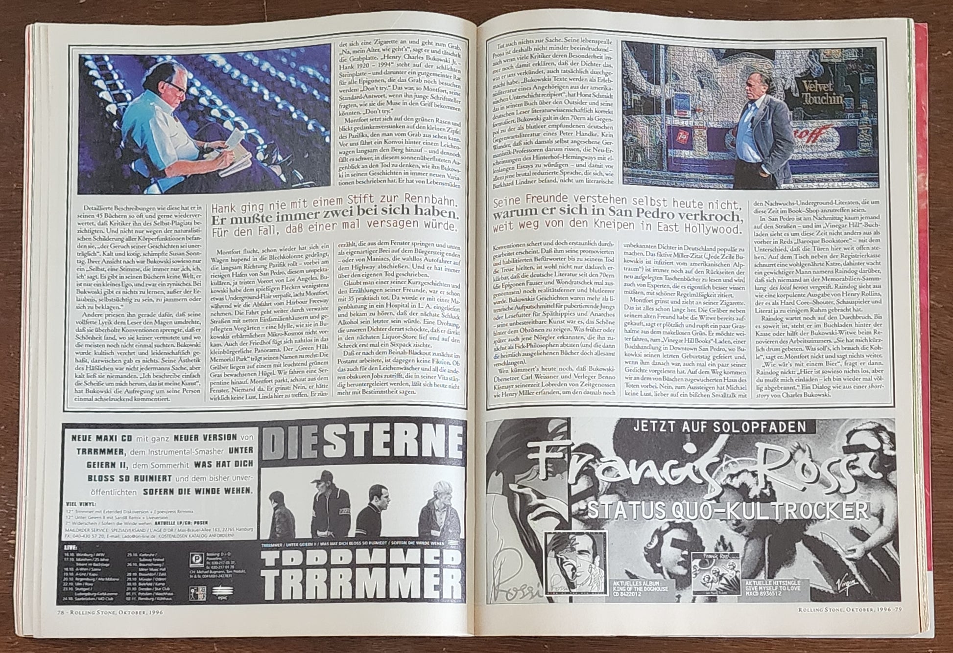 This is the German Oktober 1996 edition of Rolling Stone. Accompanying a long feature on Bukowski are four photos from the Iris Prints, a rare collection of photographs by Michael Montfort featuring Charles Bukowski. Only 26 copies of the Iris Prints were produced.