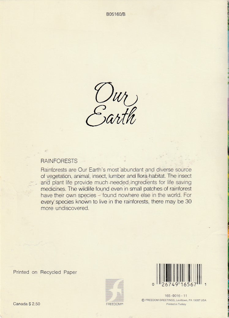 Very appropriate for the time period, it’s a Rainforest card printed on recycled paper. Inside Linda Lee has written: