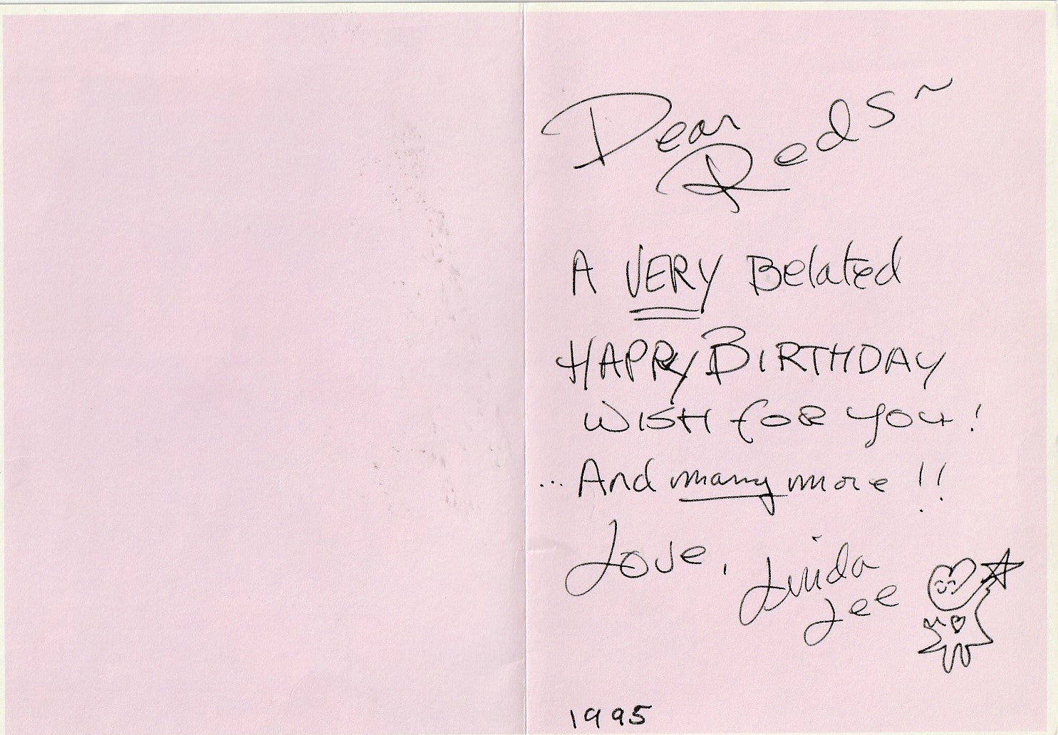 The first card may have been sent in a larger package because there is no mailing envelope, but inside the card Linda Lee dated it 1995. Red was born on May 21, 1916, so this would be the occasion of his 79th birthday -- just over a year after Charles Bukowski’s death at the age of 74.