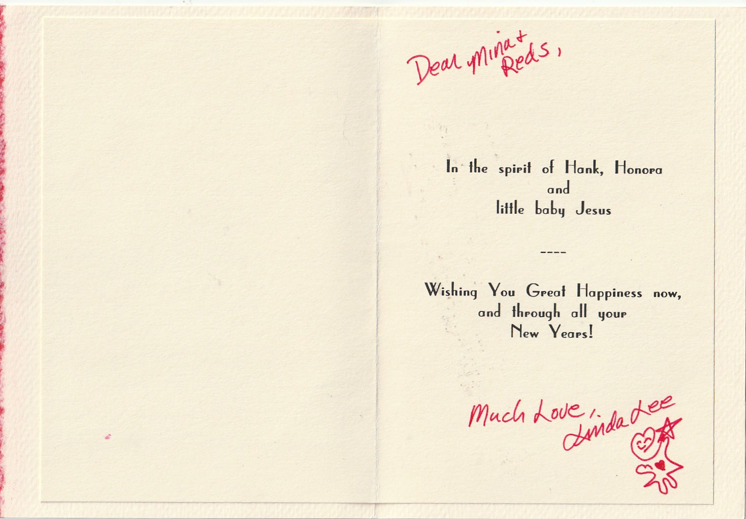 The final card is from December 1999 and is addressed only to Mina. Red passed away on October 14, 1998, from complications due to liver cancer. Judging by the address, she’s still living at home. Linda Lee writes: