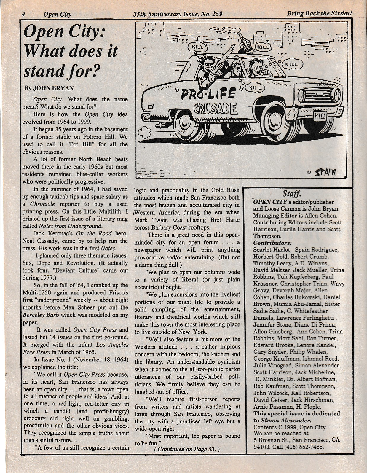 There is also a Spain Rodriquez drawing that accompanies editor John Bryan’s article, “Open City: What does it stand for?”