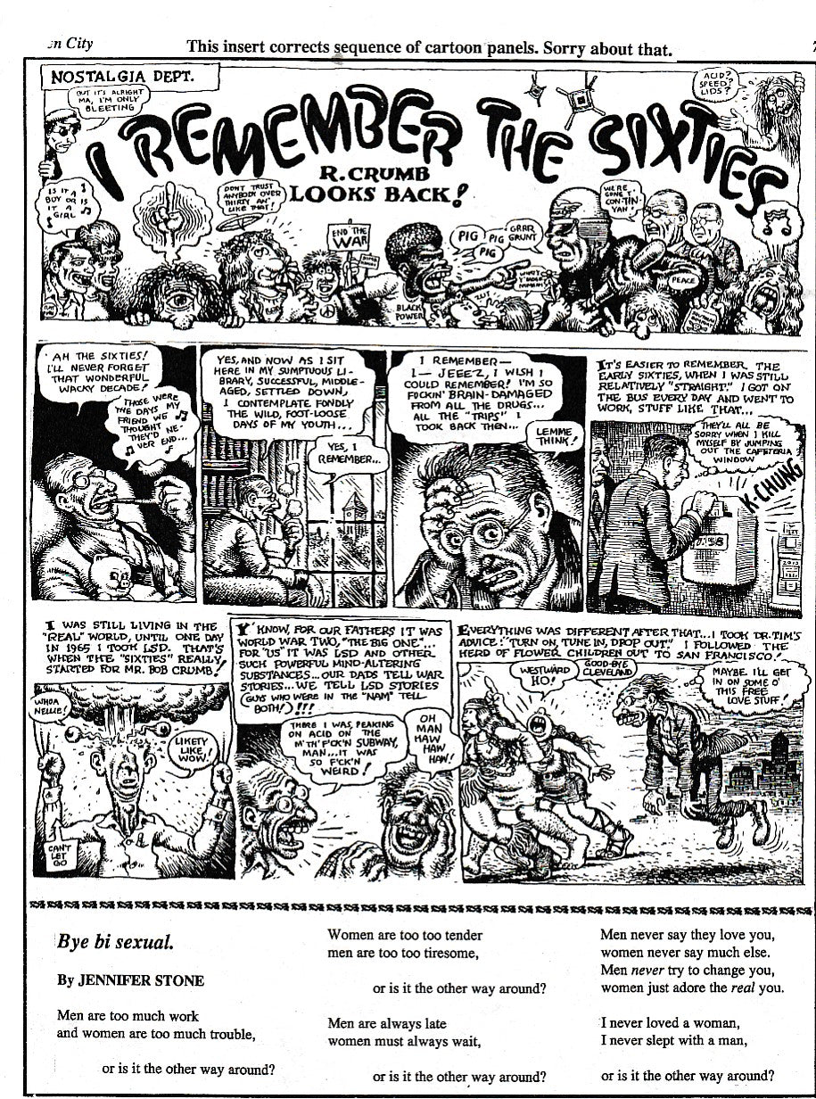 One of the best features is a six-page comic by Robert Crumb, “I Remember the Sixties”. Fittingly, the boys who produced the issue messed up the order of the pages, so there is an insert that helps correct that.