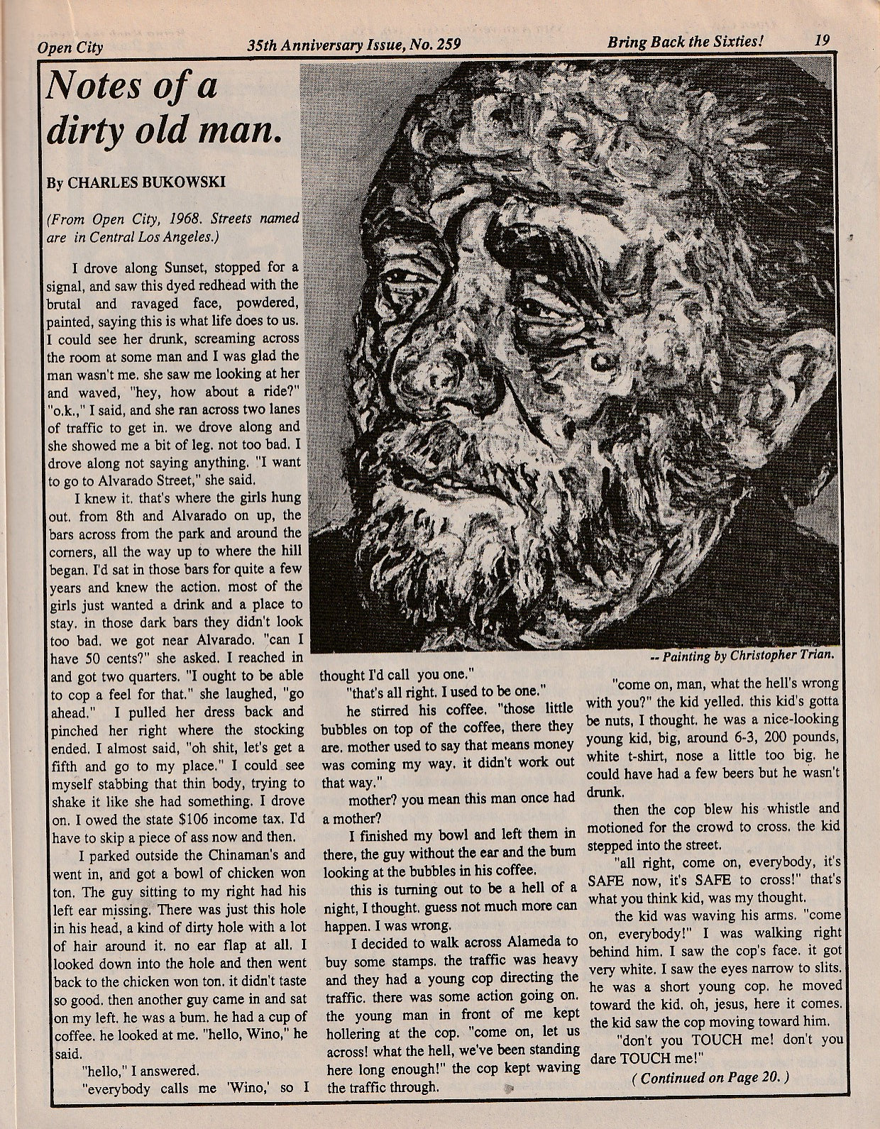 Open City put Bukowski on the map, beginning with his first appearance in November 1967. His Dirty Old Man column soon developed a huge following, continuing with the L.A. weekly after Open City shut down and in syndication by underground newspapers throughout the country.