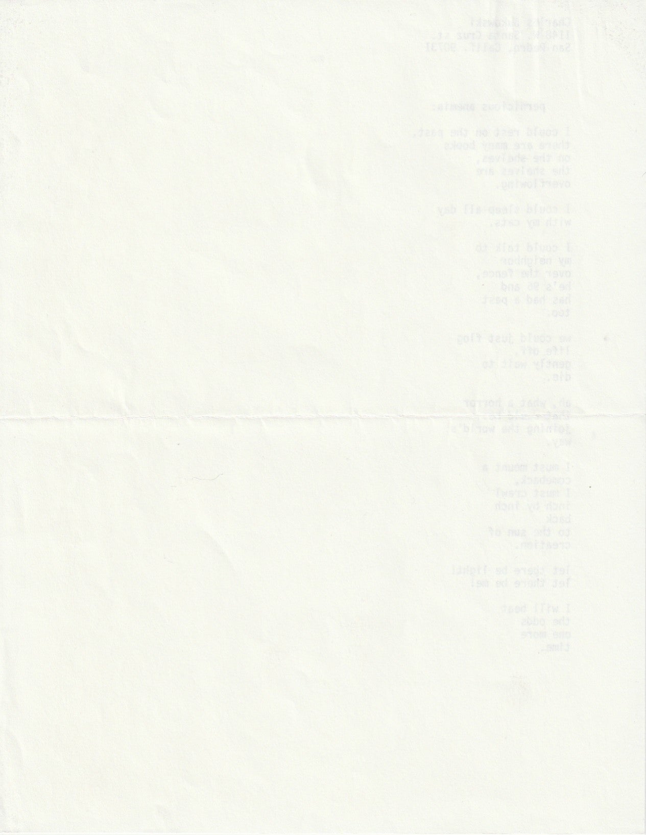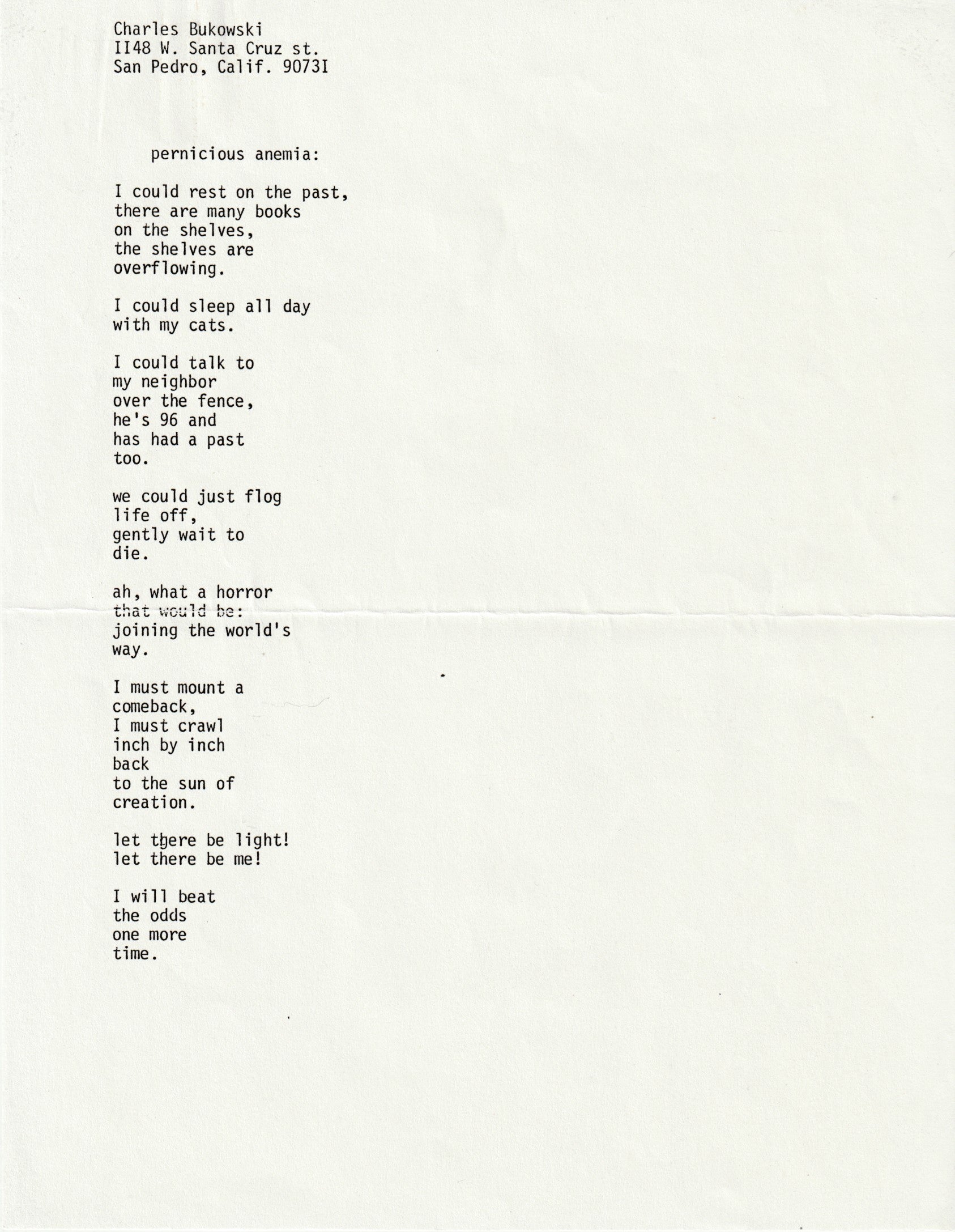 Pernicious Anemia: Unsigned Poem by Charles Bukowski