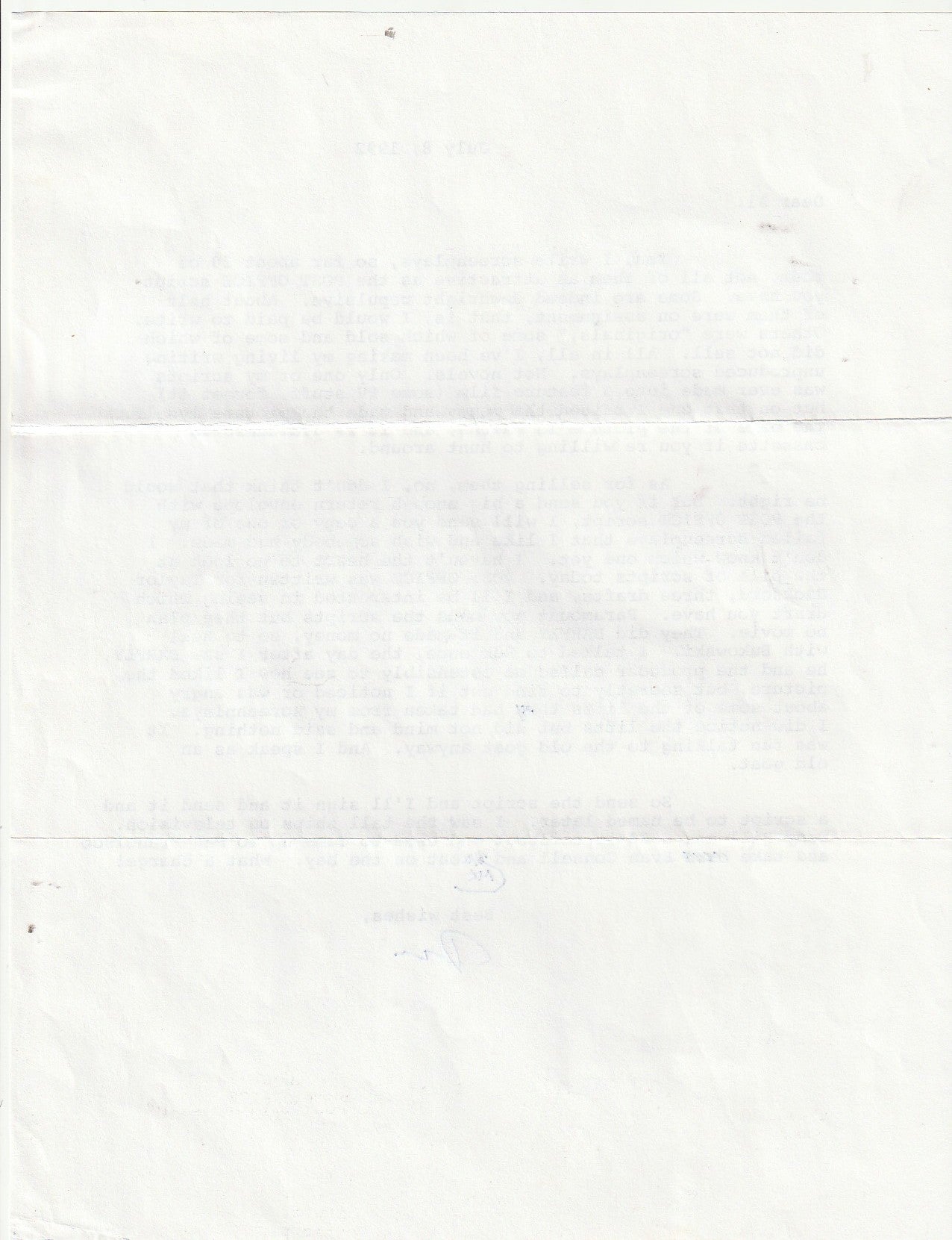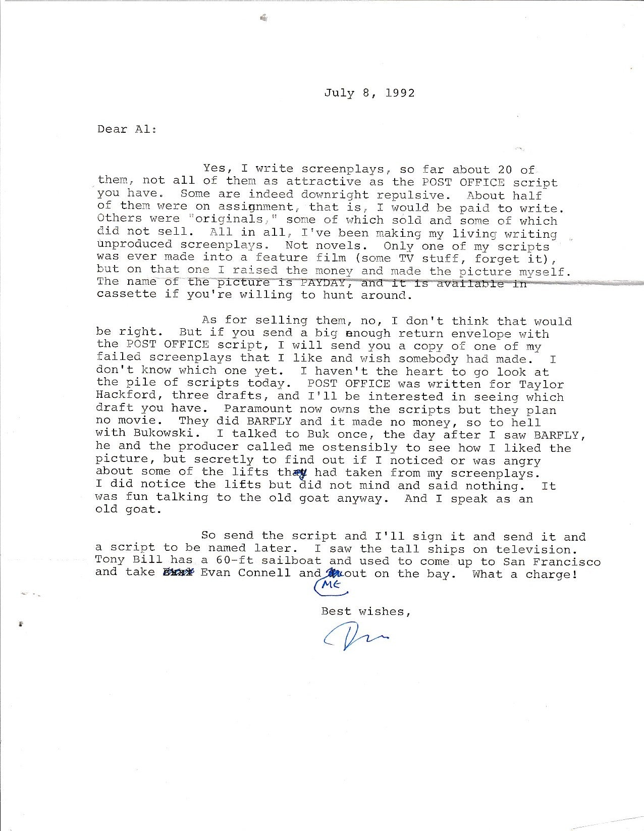 The screenplay comes with a fascinating letter signed by Carpentar. It starts with a description of his past work on screenplays, but the majority is about the Post Office screenplay and Bukowski. He recalls Bukowski and the producer of Barfly calling him once “secretly to find out if I noticed or was angry about some of the lifts they had taken from my screenplays. I did notice the lifts but did not mind and said nothing.”