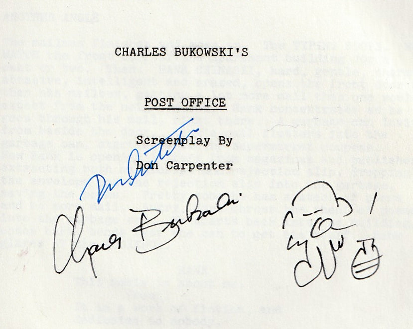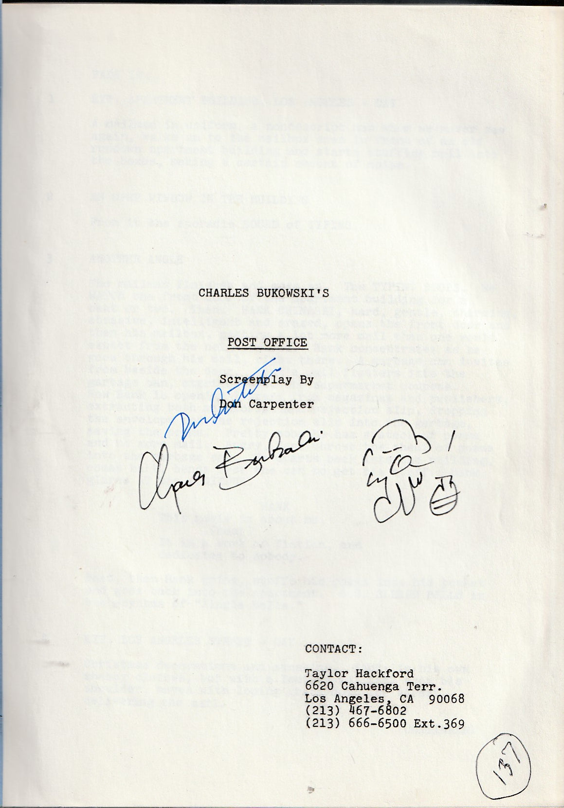 The screenplay is signed by both Bukowski and Carpenter on the title page and Bukowski has added his little man with a bottle sketch.