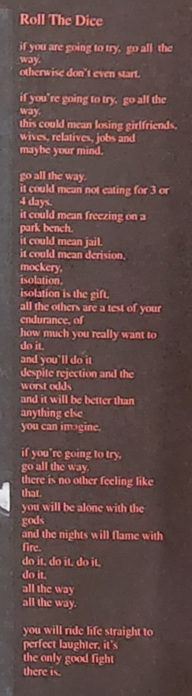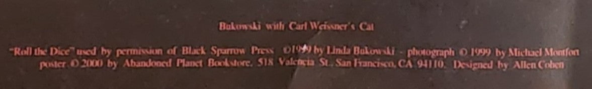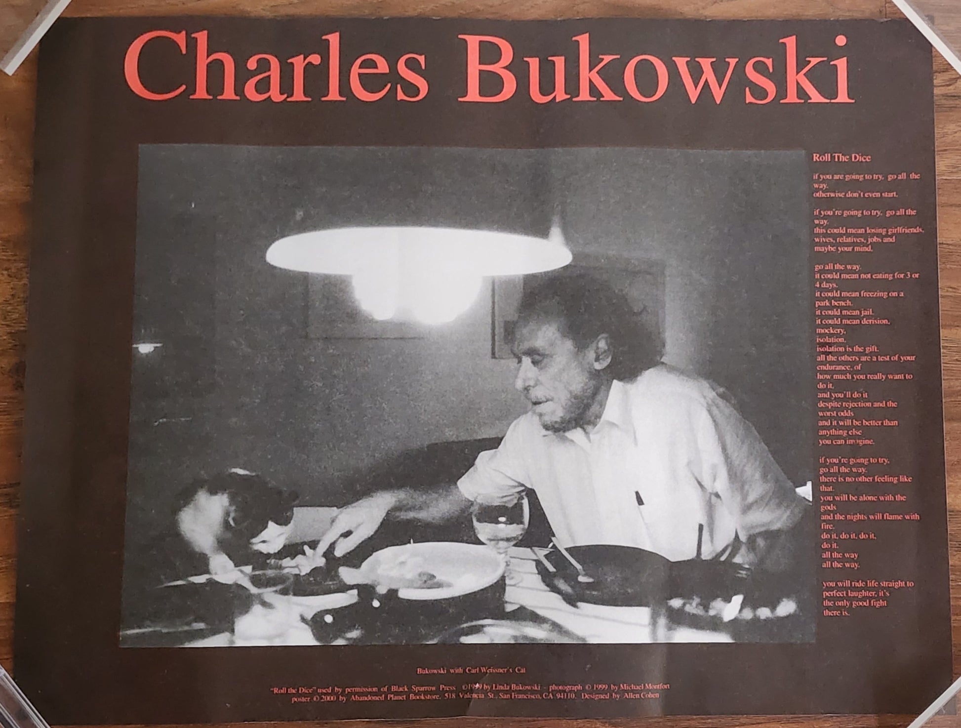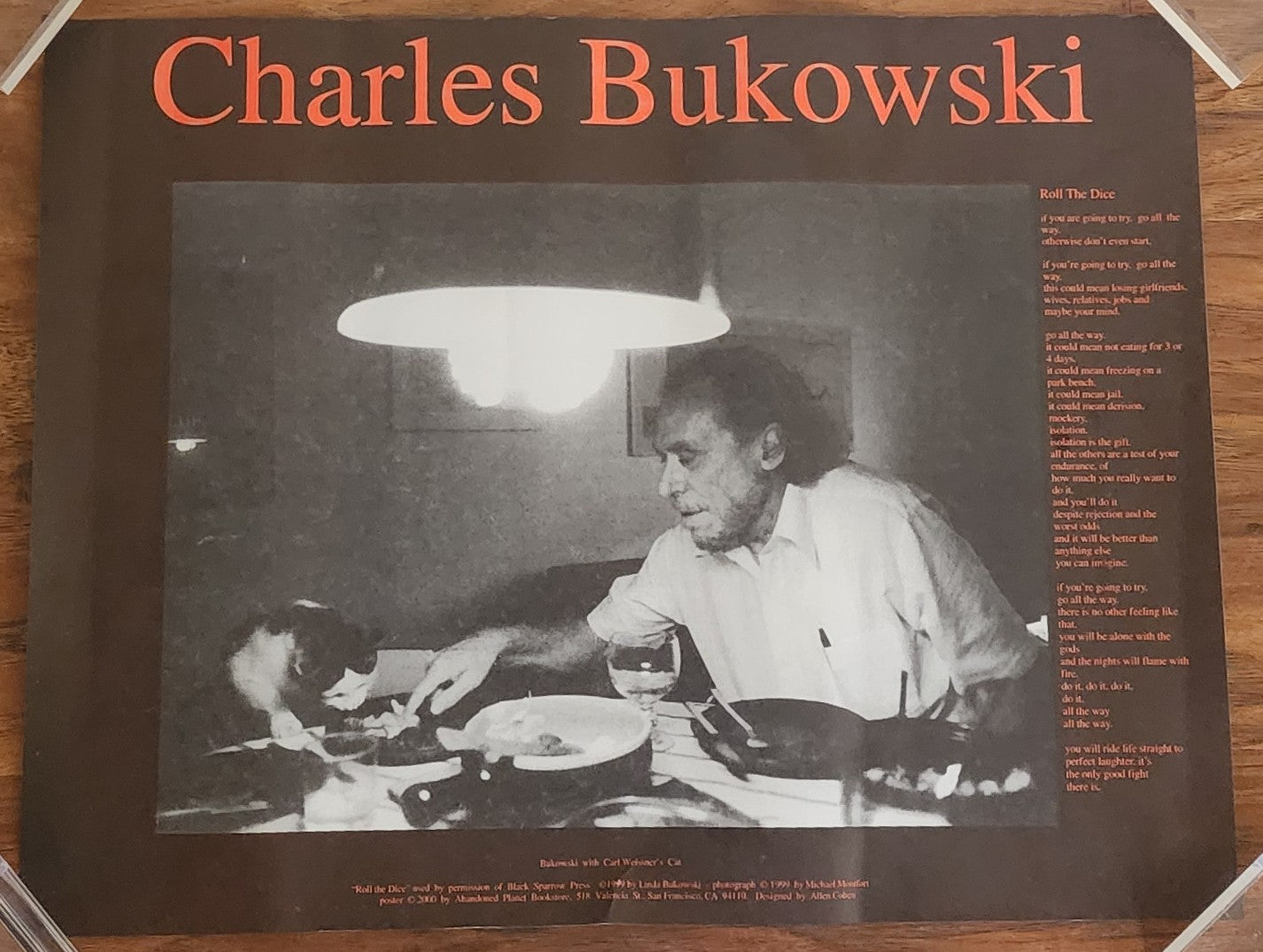 It features one of Bukowski’s most famous poems, “Roll the Dice” and a photograph of Bukowski by Michael Montfort.