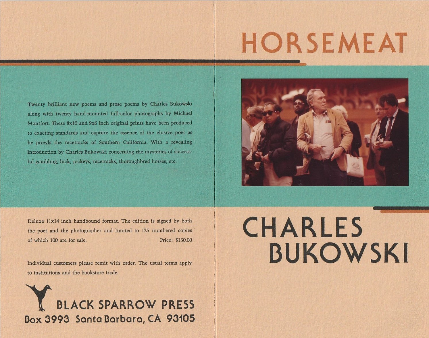 Published in 1982, Horsemeat captures a day at the track with Charles Bukowski. It contained 20 photographs by Michael Montfort and text by Bukowski.