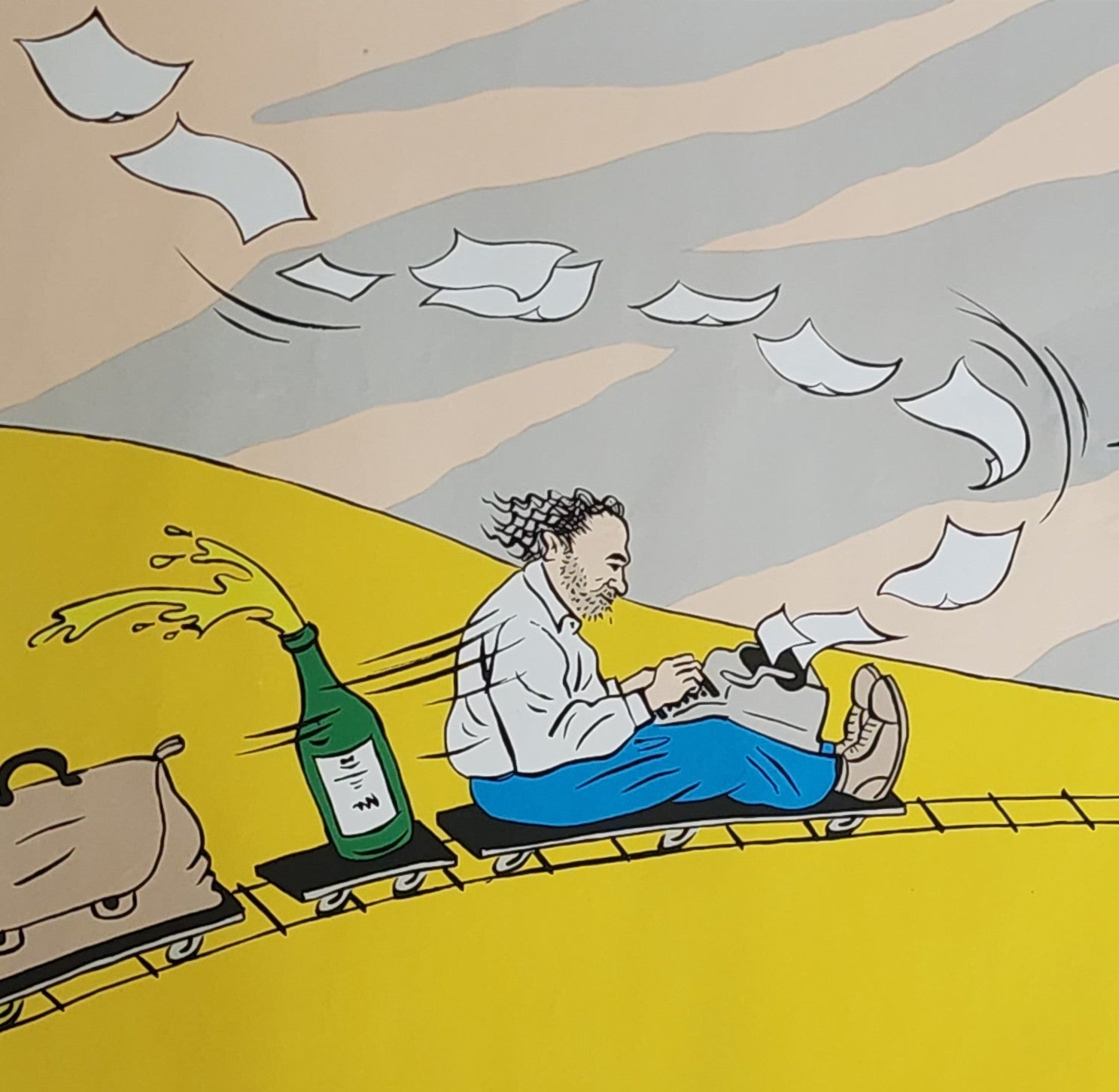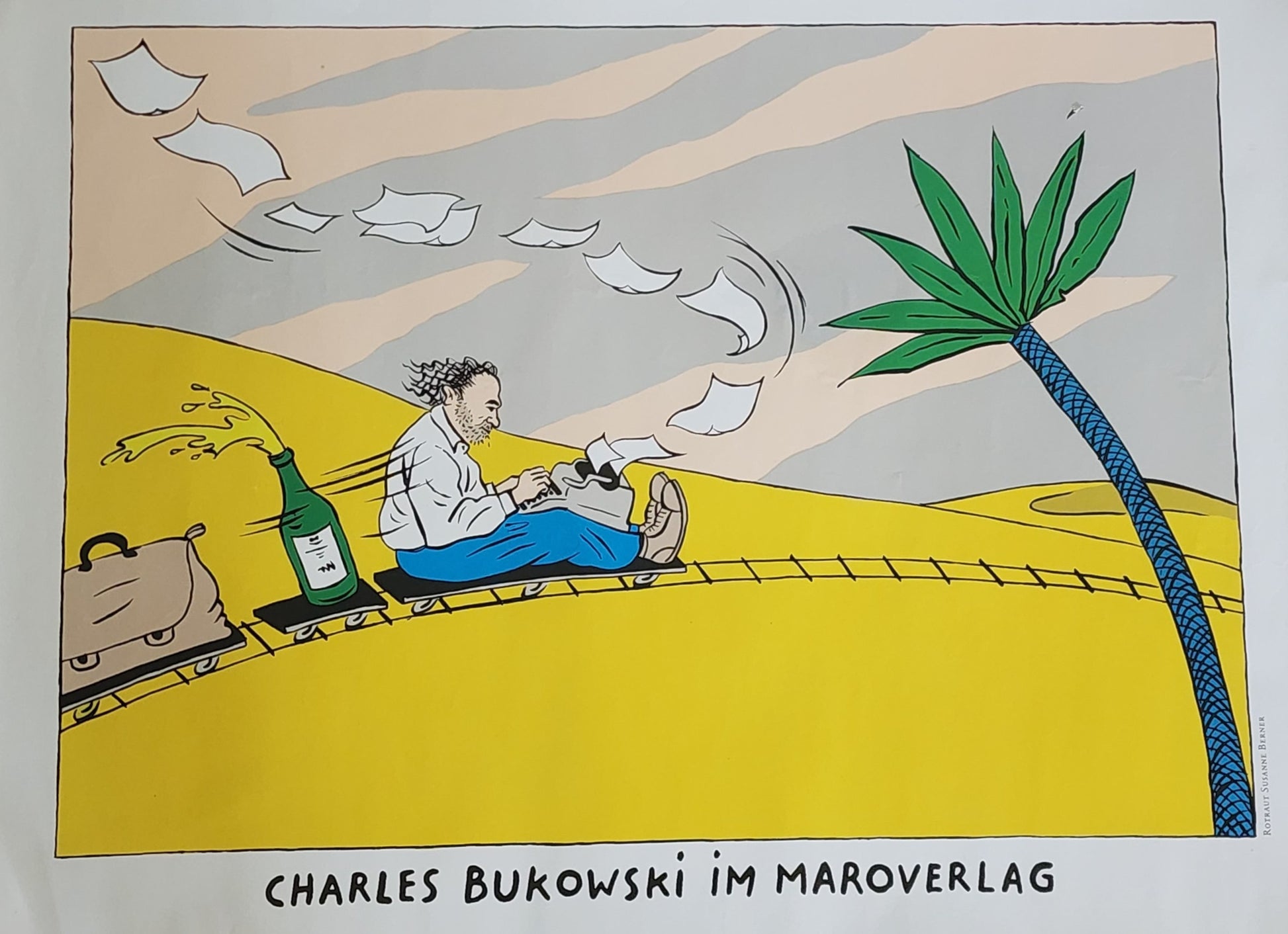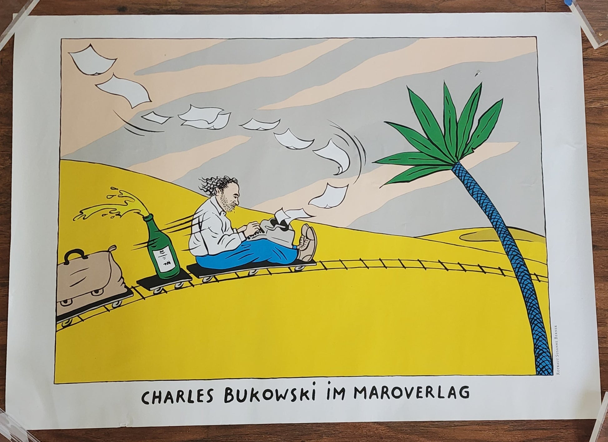 The artist behind this print is Rotraut S Berne. who did the drawings for Bukowski’s book Einmal New Orleans Und Zuruck as well as the drawings for all other MaroVerlag Bukowski books. A version of the drawing is featured on the cover of Einmal New Orleans Und Zuruck