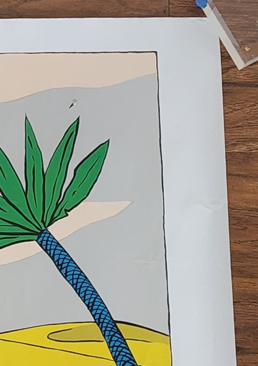 The poster measure.s approximately 17” x 25” and is printed on glossy paper. There are some creases along the edges, but they shouldn’t be very noticeable if framed. See photos.