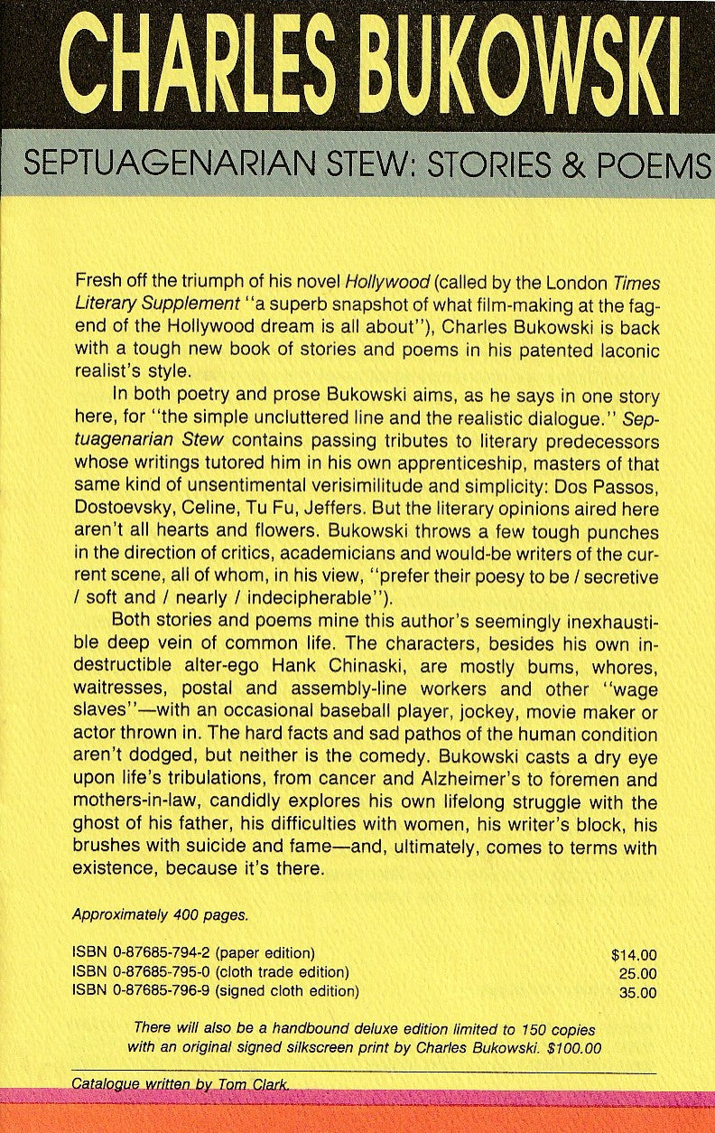 This is a First Edition Hardcover Signed copy of Septuagenarian Stew by Charles Bukowski.