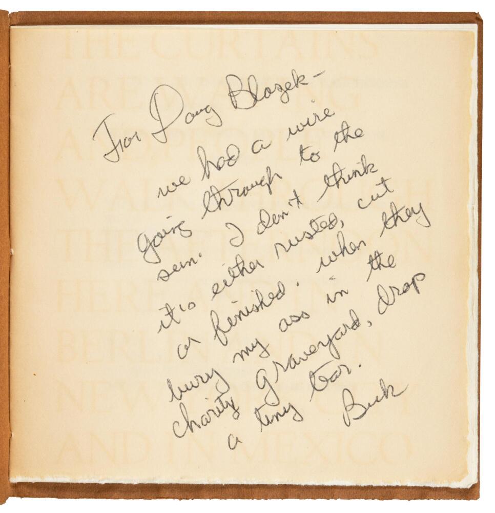 Bukowski and Blazek considered themselves friends and had a lengthy correspondence between 1964 to 1968. But as with several other writers and editors, the relationship ended abruptly after they first met in person. The inscription indicates the fallout had already begun: