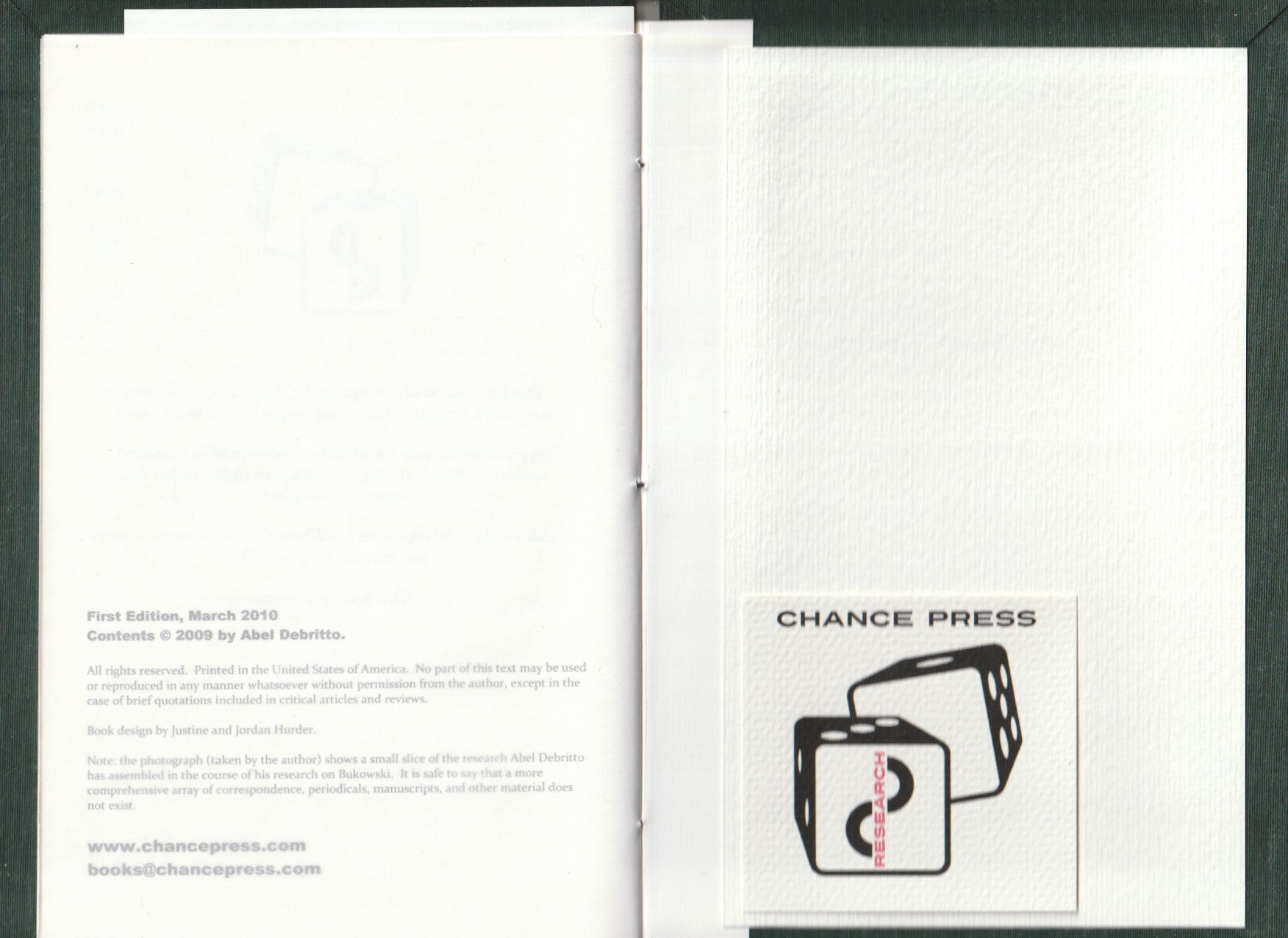 This is a beautiful book published by Chance Press in 2010. It is one of 25 copies in a hardcover format that are signed by Debritto. The craftmanship shown in the book’s design and execution is magnificent.