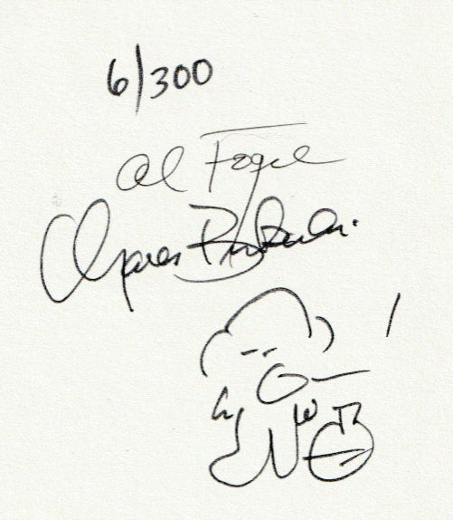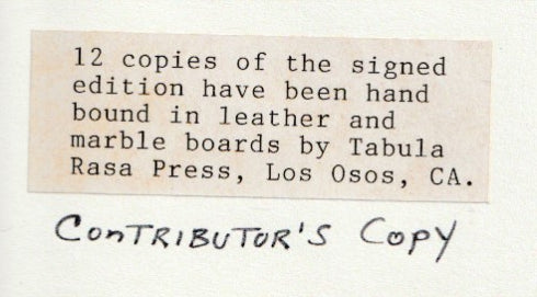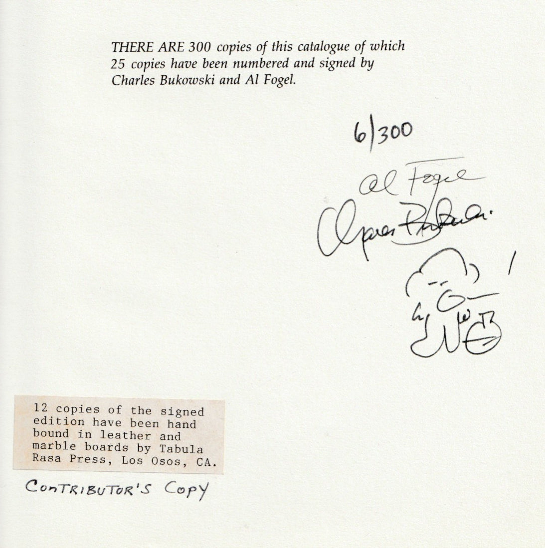 It is signed by Charles Bukowski (with his classic Little Man with a Bottle) and legendary Bukowski collector and bibliographer Al Fogel. It is of 12 Contributor Copies that were “bound in leather and marble boards by Tabula Rasa Press, Los Osos, CA.”