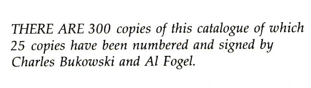 Charles Bukowski not only approved of the catalog, but contributed to it with four full-page original drawings and the first appearance of the poem, About A Non-Typing Night. The poem is printed in the form of a hand-written facsimile. There are also nine photographs by Bukowski’s personal photographer, Michael Montfort.