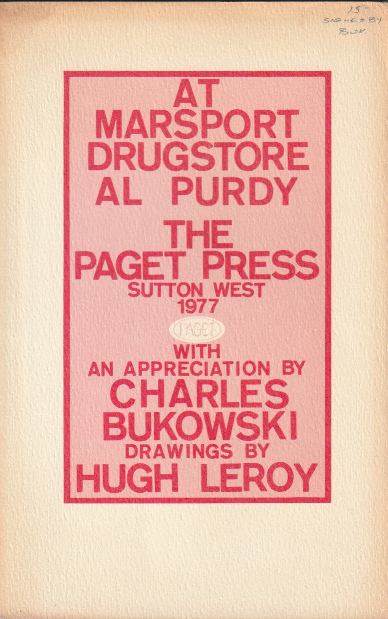 Paget Press published “At Marsport Drugstore” in 1977 as a collection of Purdy’s poems. Bukowski’s short introduction may have been the influence for the latter book of letters. In it, he mentions somewhat bitterly that the correspondence suddenly stopped, later on indicating he thought Purdy’s success had something to do with it. Bukowski wrote a poem about the subject around the same time as the introduction.