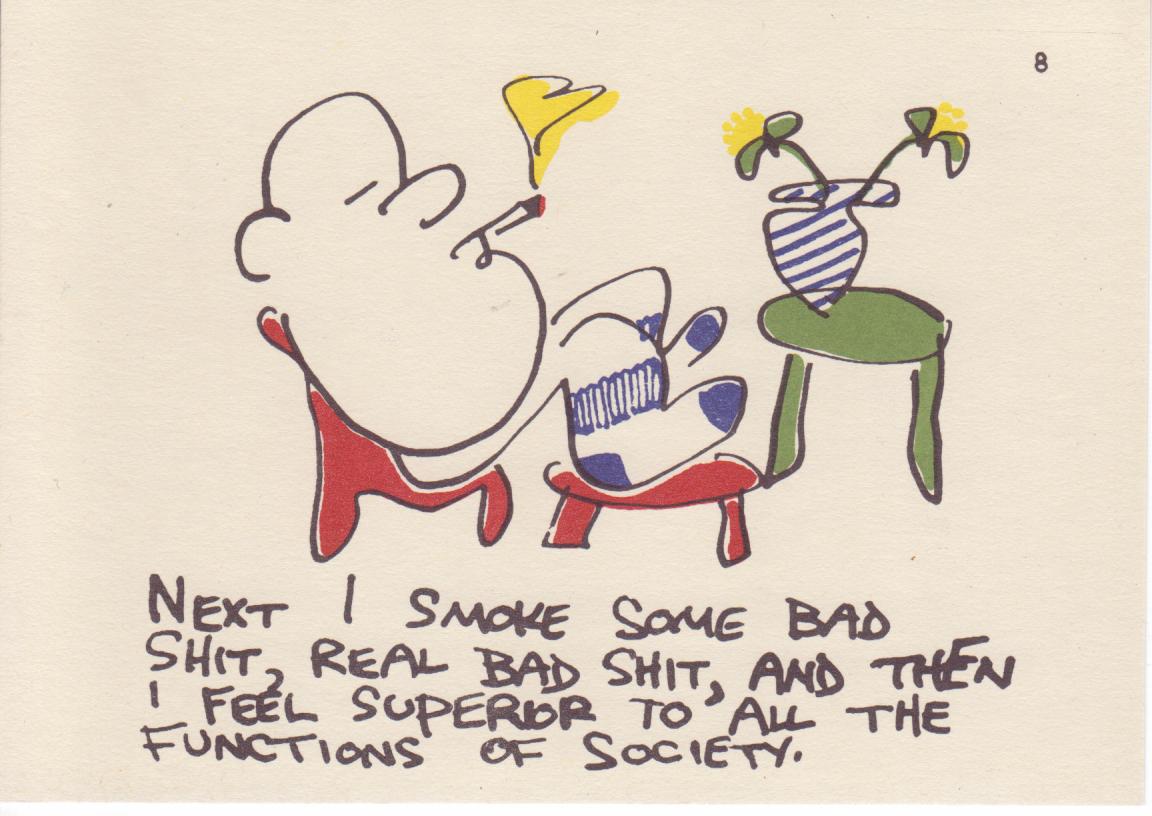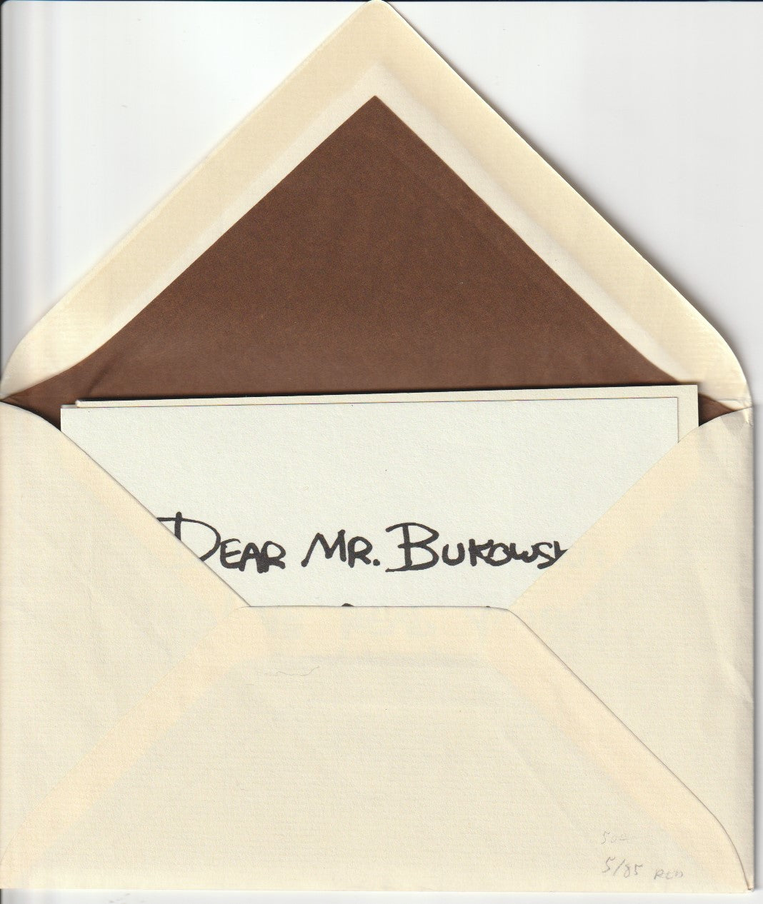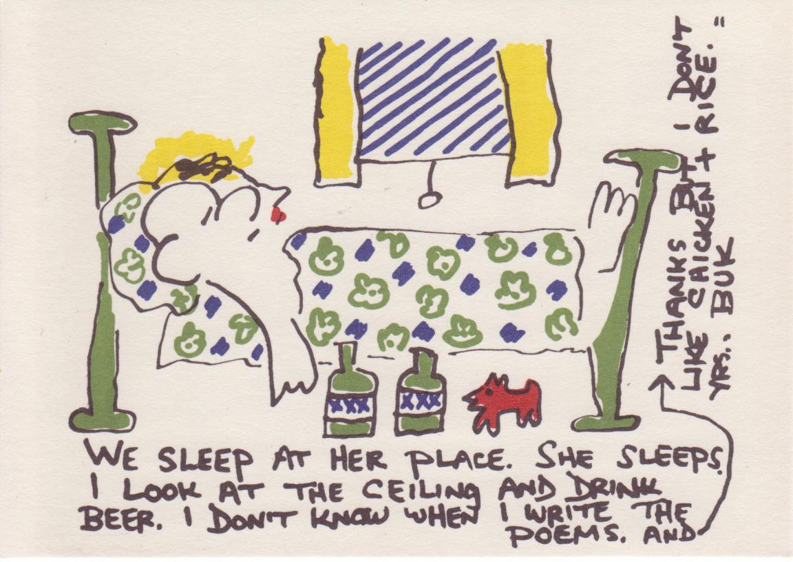 The set is made up of a fictional envelope and letter, and 10 individual silkscreen drawings by Bukowski. The drawings are an attempt to describe the question in the letter: “What we are wondering is what is your typical day like?”