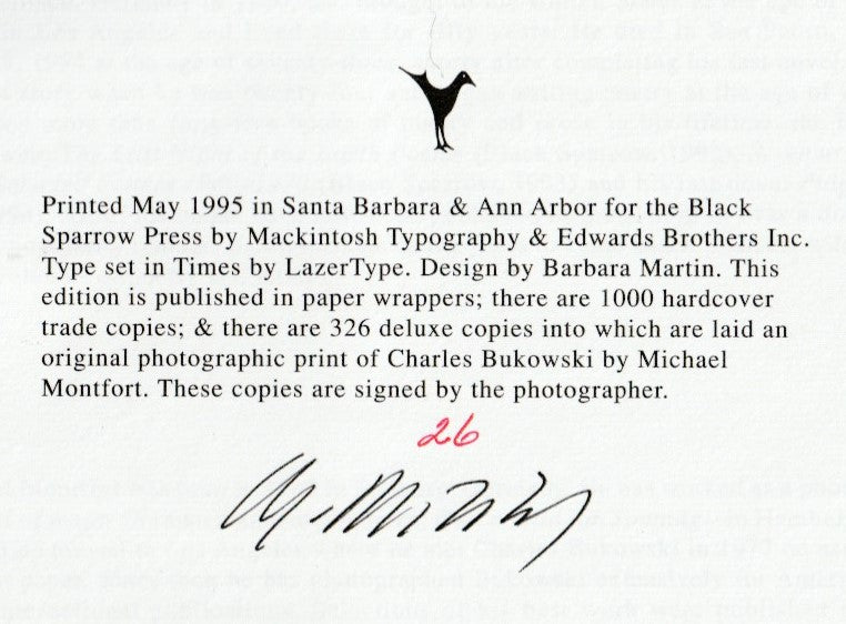 This is the Black Sparrow first edition from 1995. (City Lights first published the book in 1979). This copy is in fine condition in printed paper-covered boards with cloth spine and printed label. Comes with the acetate dust jacket.