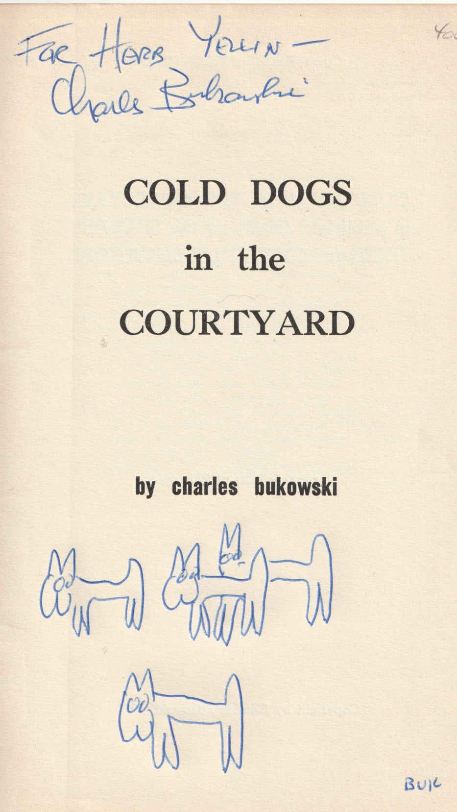 This copy is inscribed to Helb Yellin with a period signature by Charles Bukowski. Bukowski has also added four dogs under his name and signed the drawing “Buk”.