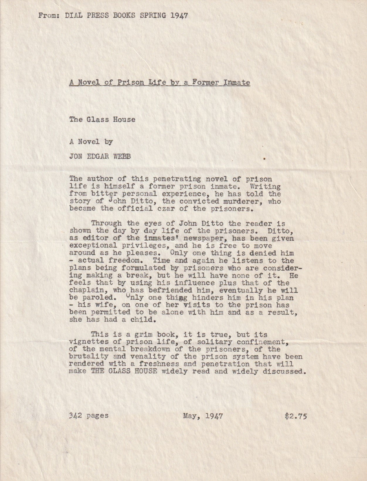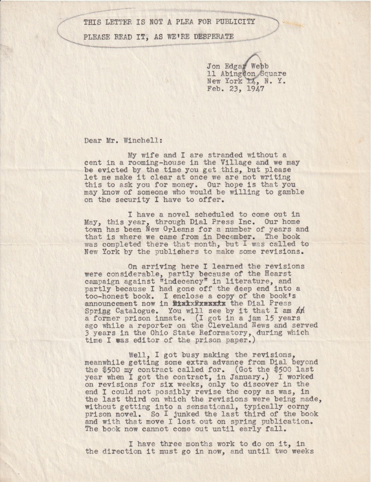 This is a signed, three-page letter from Jon Edgar Webb to famed journalist Walter Winchell from Feb. 23, 1947. The letter comes with a one-page manuscript from Dial Press Books, announcing the publication of “The Glass House”, the working title at the time for what would become Webb’s novel, “Four Steps to the Wall.” For reasons Webb would explain to Winchell, the novel would be delayed due to required rewrites.