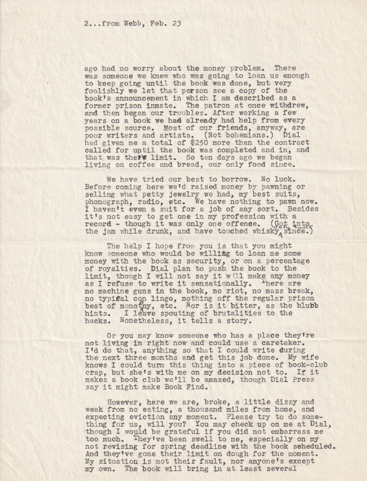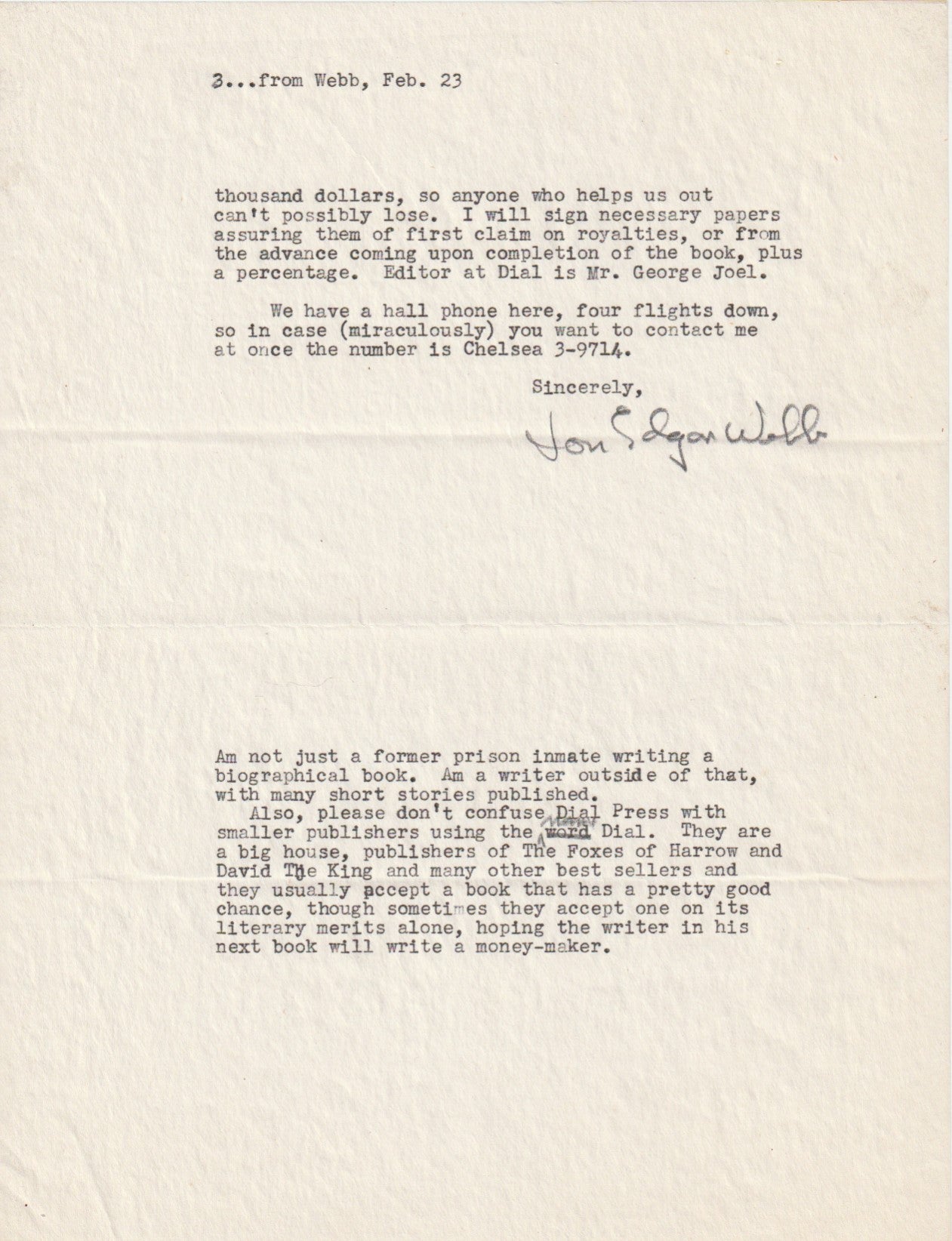 But Webb wasn’t asking for a simple handout in his letter. Rather, he was asking if Winchell (or someone Winchell knew) would be interested in a portion of his royalties when the book was finally published (plus a percentage) in exchange for a loan to get him through the revisions. He included the Dial announcement as proof the book would be published, and Webb said he expected it to bring in thousands of dollars in royalties.