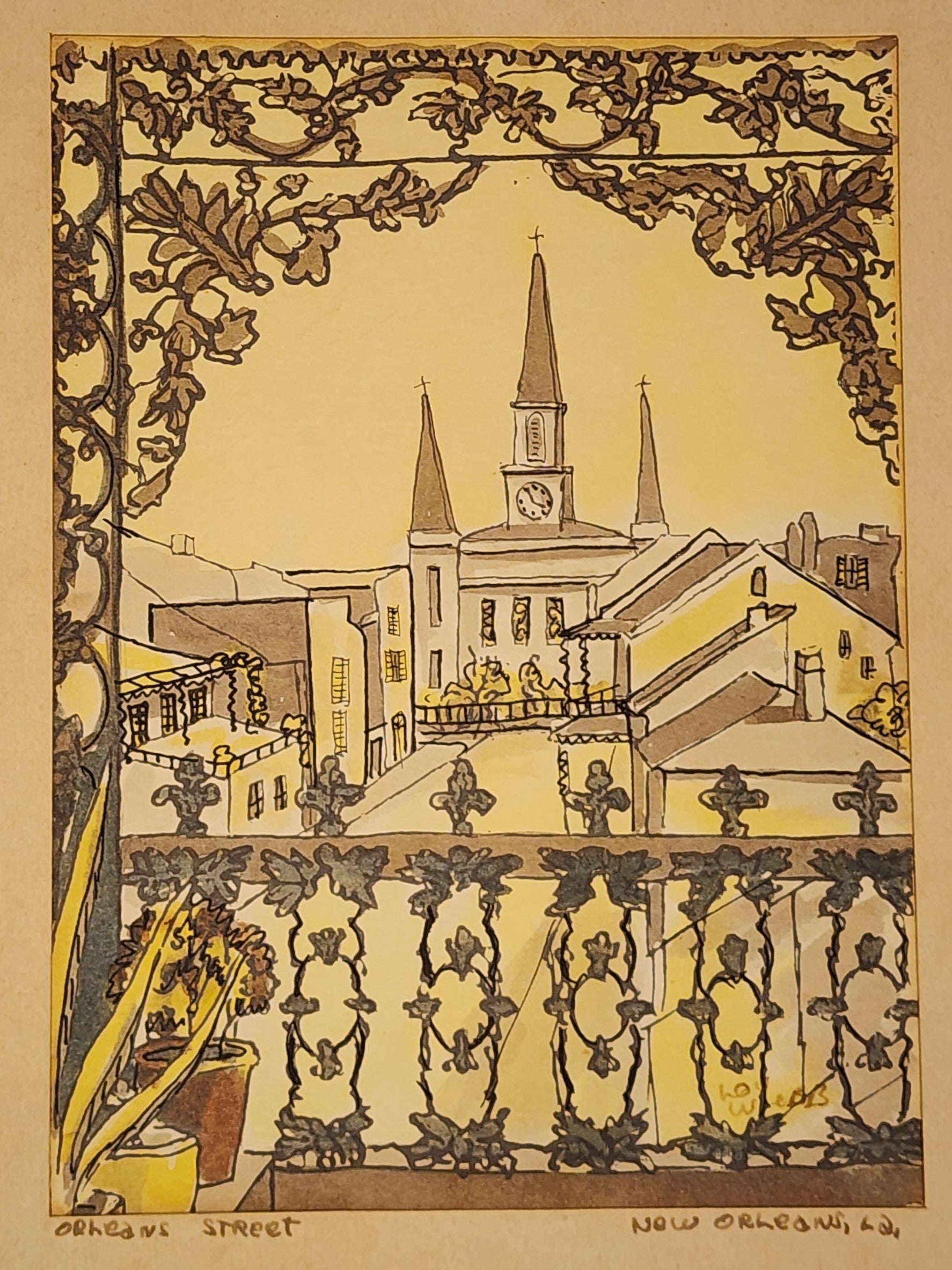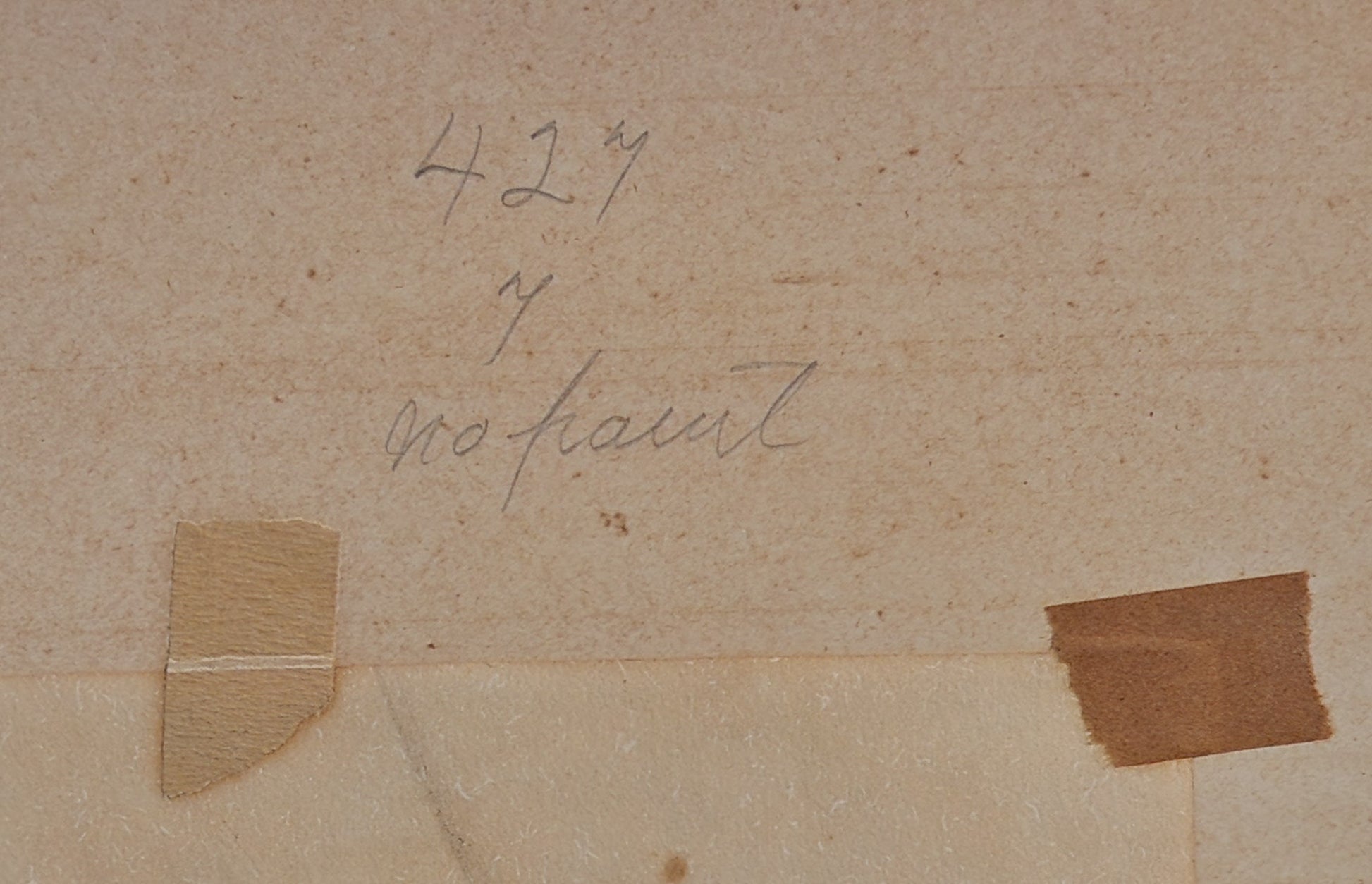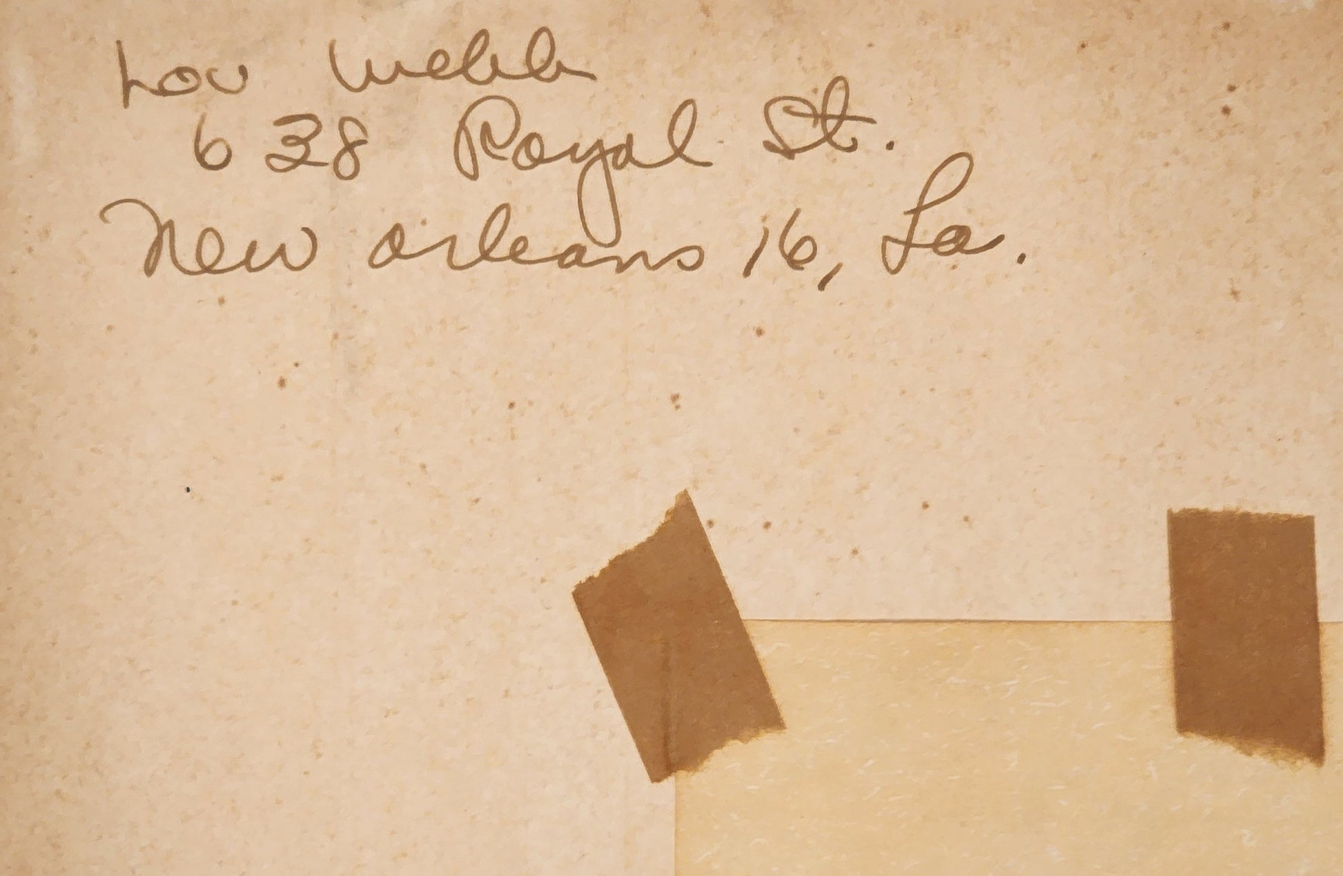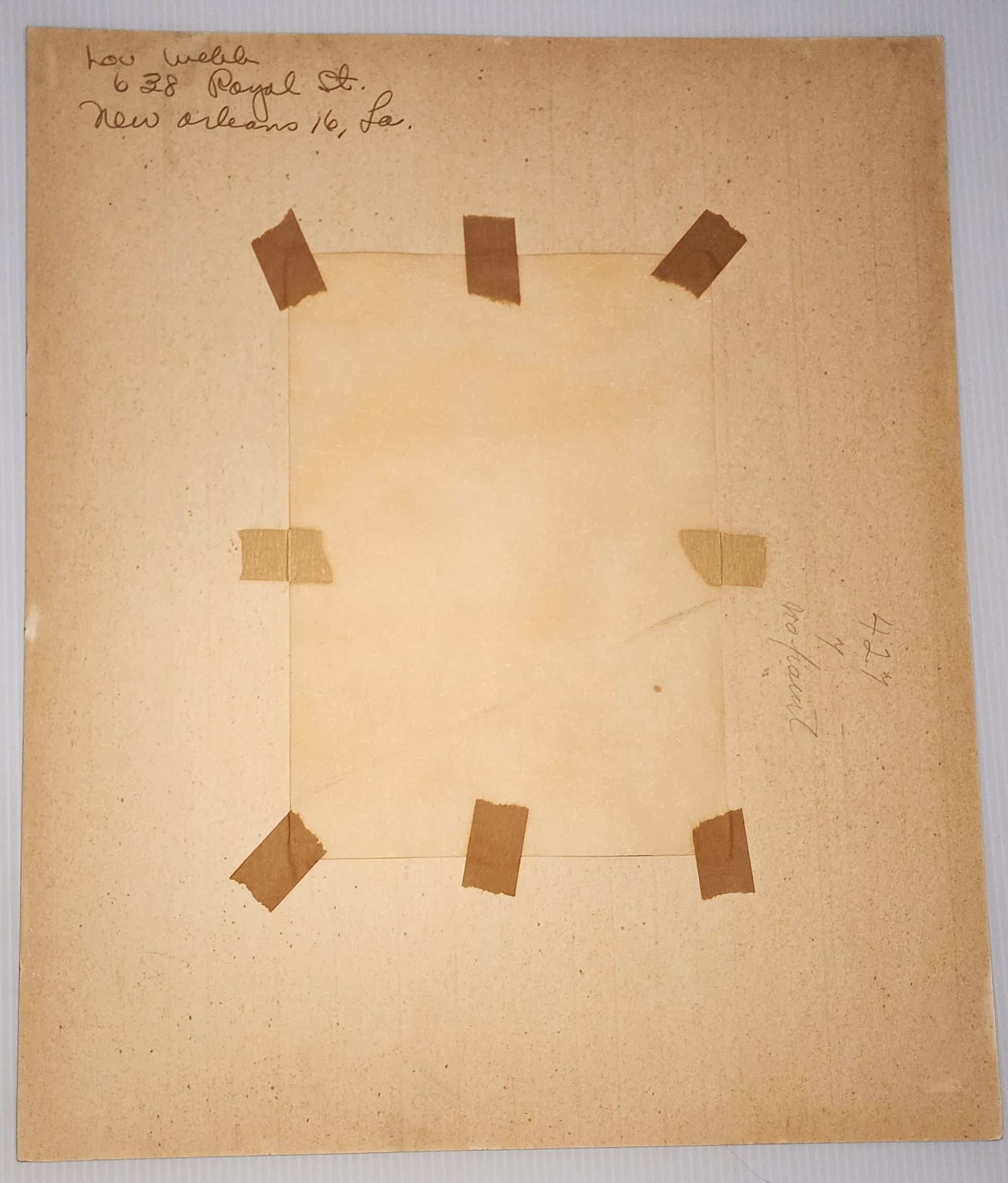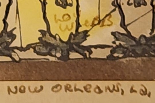 This is a signed, undated silkscreen or watercolor by Gypsy Lou Webb, secured by tape in the original large mat with her signature, address, and some other notations by her on the back.