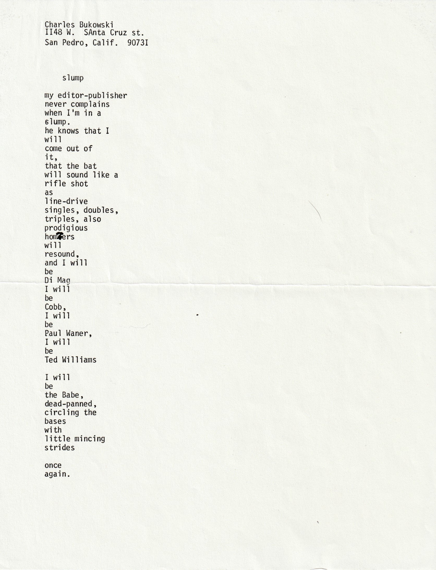 It features the poem Slump, which appeared in the book Septuagenarian Stew, published by Black Sparrow Press in 1990.