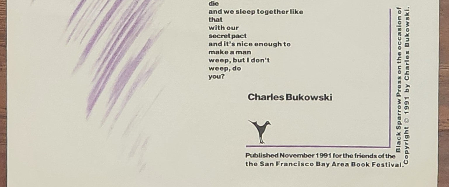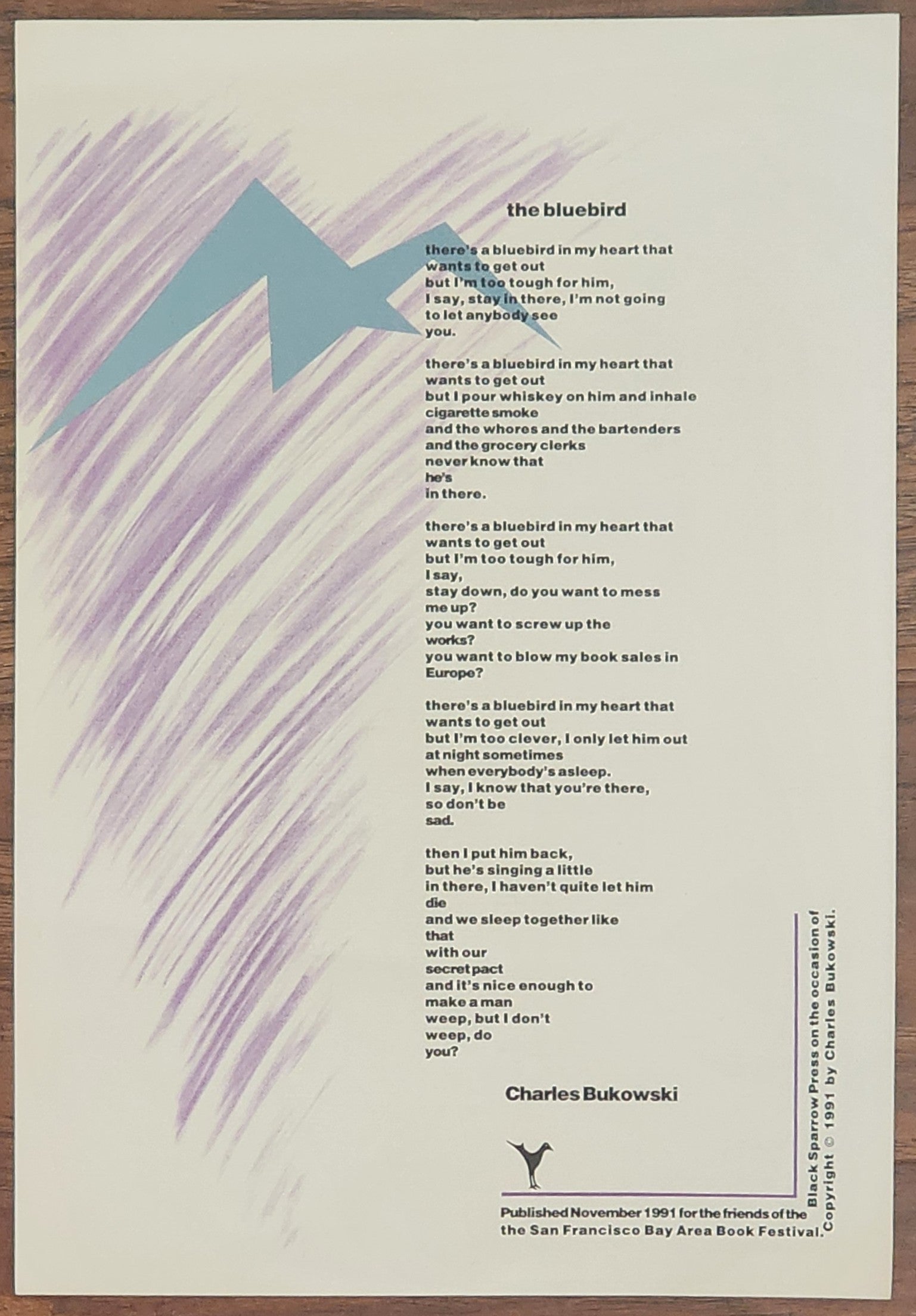 The Bluebird broadside was issued for friends of the Black Sparrow Press on the occasion of the San Francisco Bay Area Book Festival in 1991.
