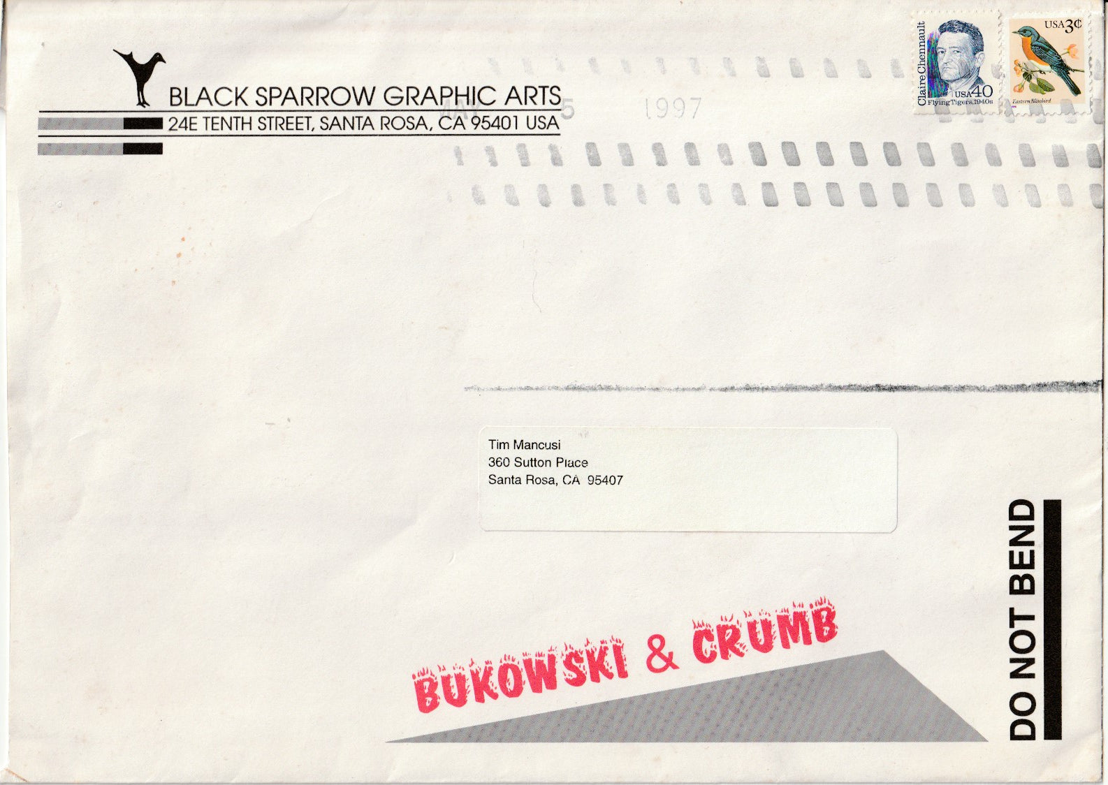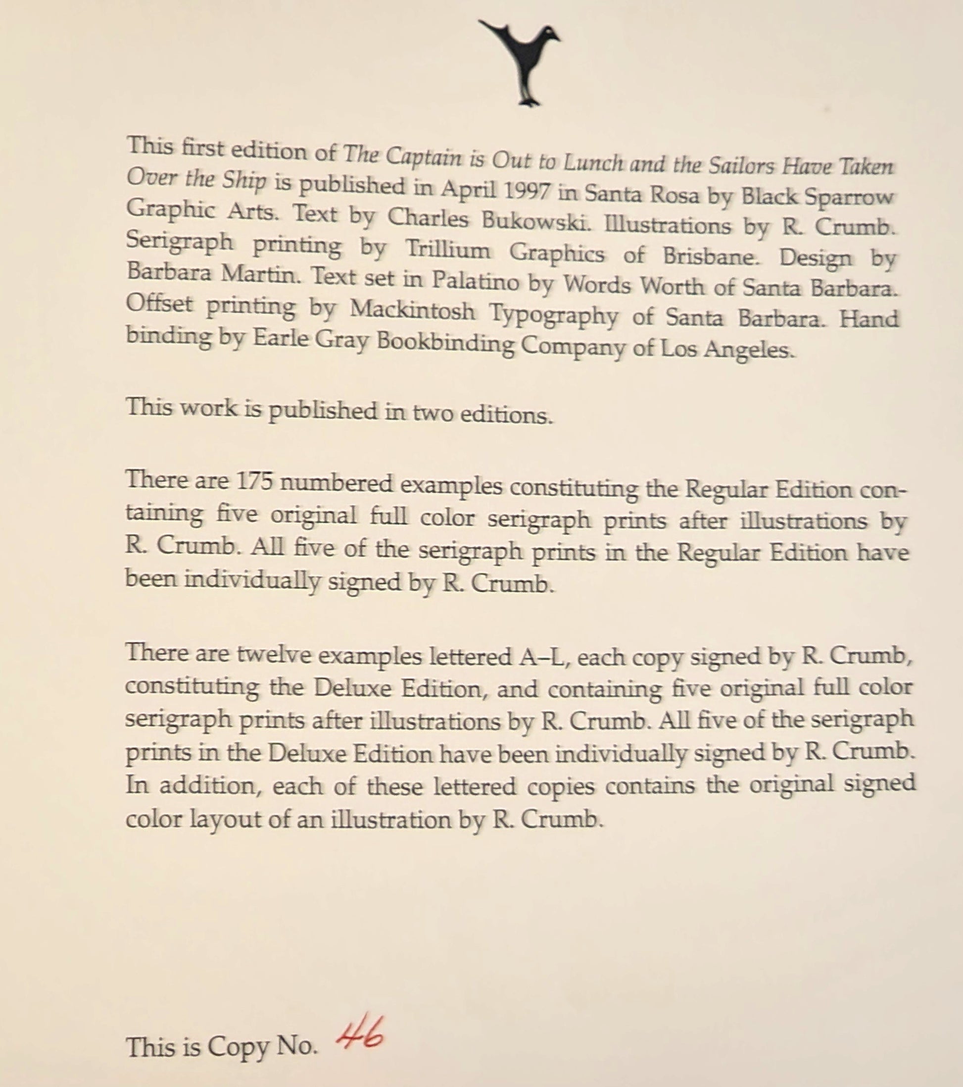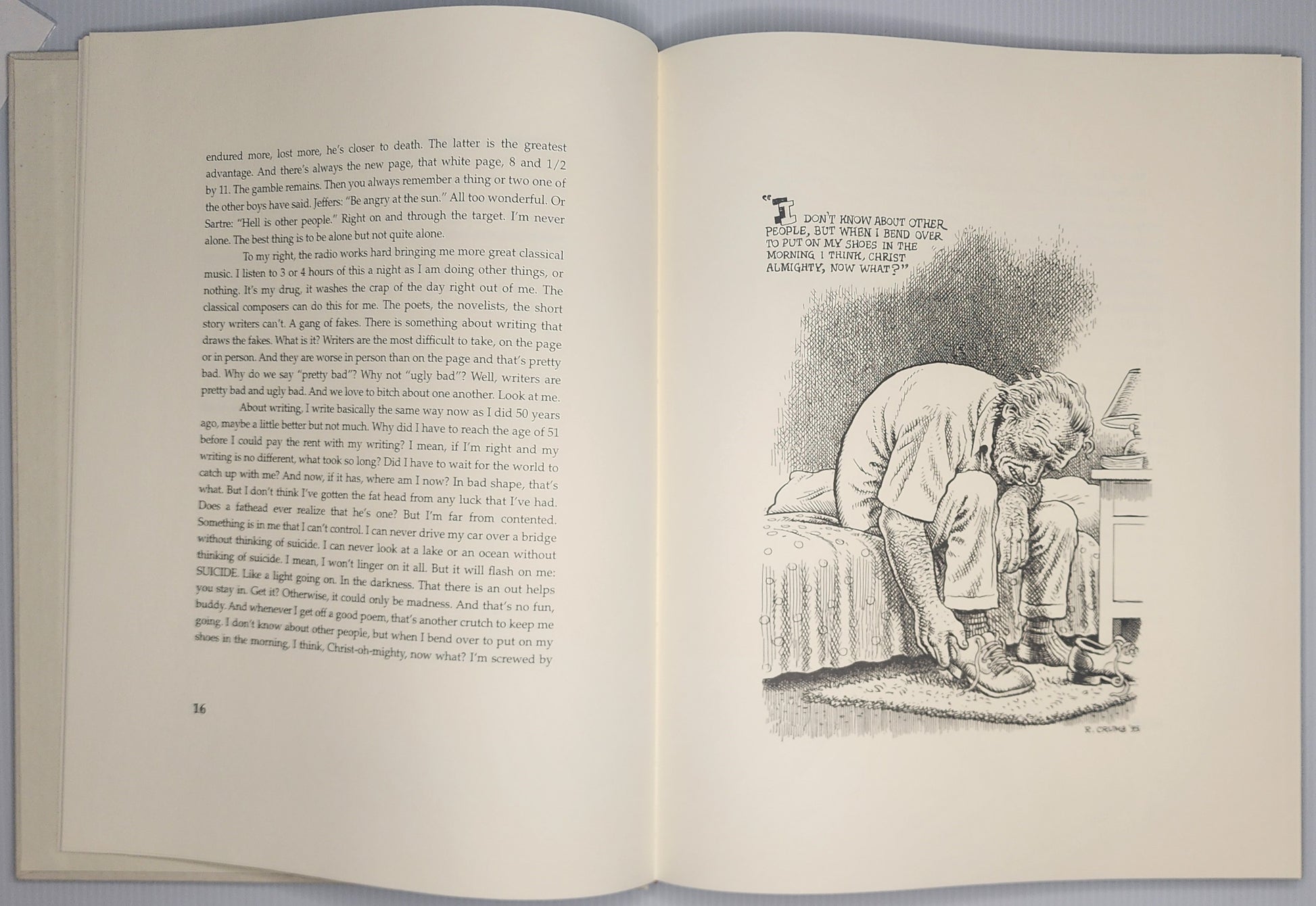 This copy also comes with the rare prospectus for the book. It is one glossy sheet folded once to make a four-page booklet. It features information about Crumb and the book, with illustrations of the serigraphs. It is housed in the original Black Sparrow Press mailing envelope, which also promotes the book.