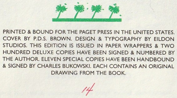 There were only 200 hardcover copies of The Day It Snowed In L.A. printed, each signed by Charles Bukowski. This is copy #14/200.