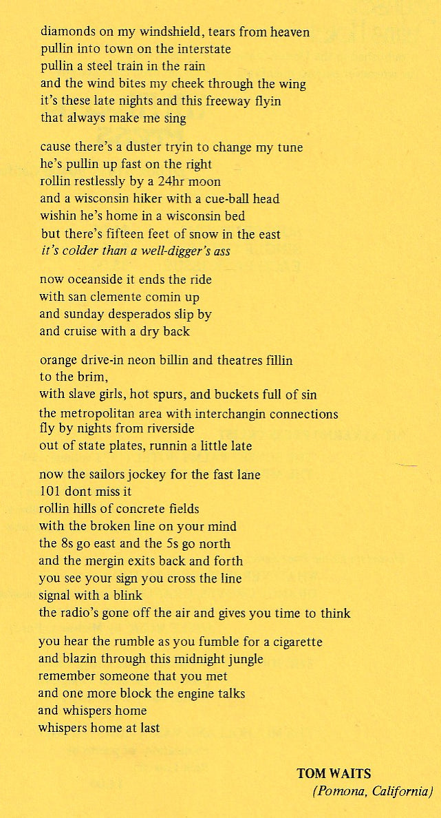 It also features the original lyrics to Diamonds on My Windshield by Tom Waits.