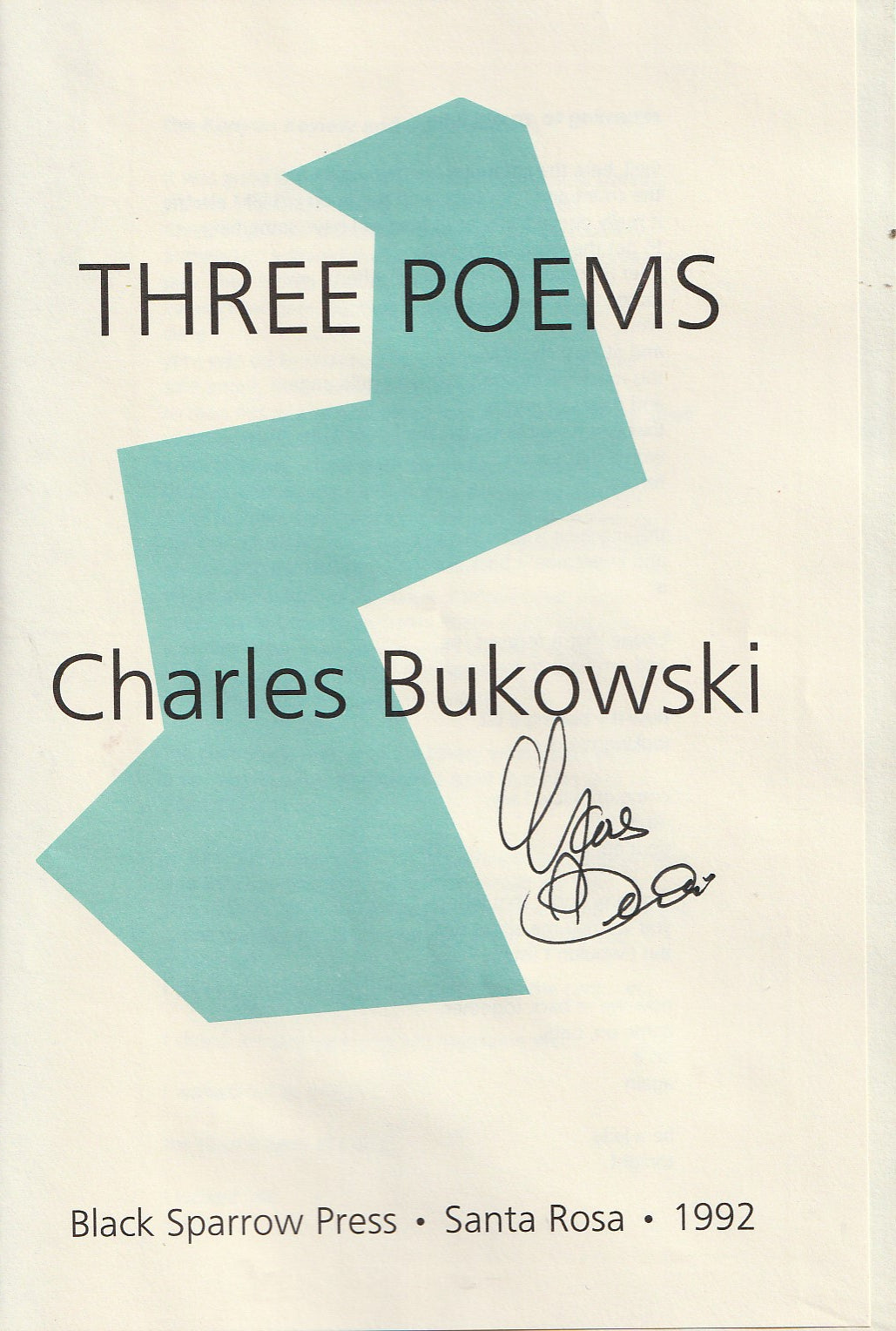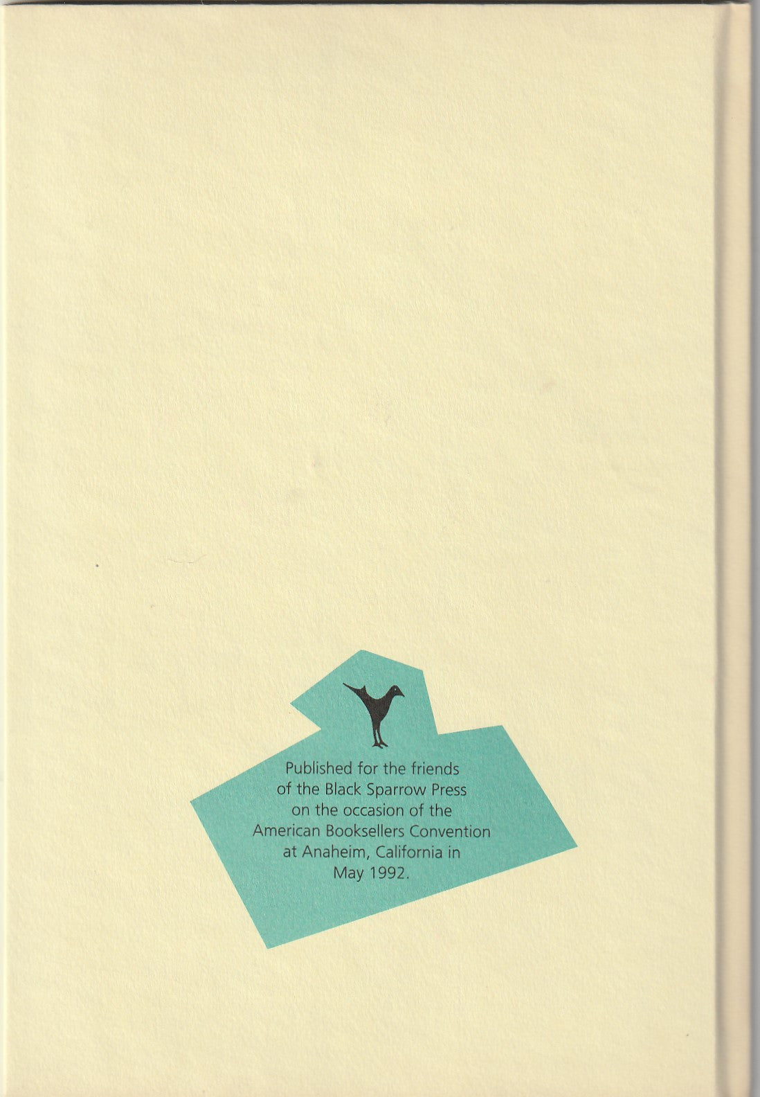 Black Sparrow printed 103 Hardcover versions of this chapbook in 1992 “on the occasion of the American Booksellers Convention in Anaheim.”