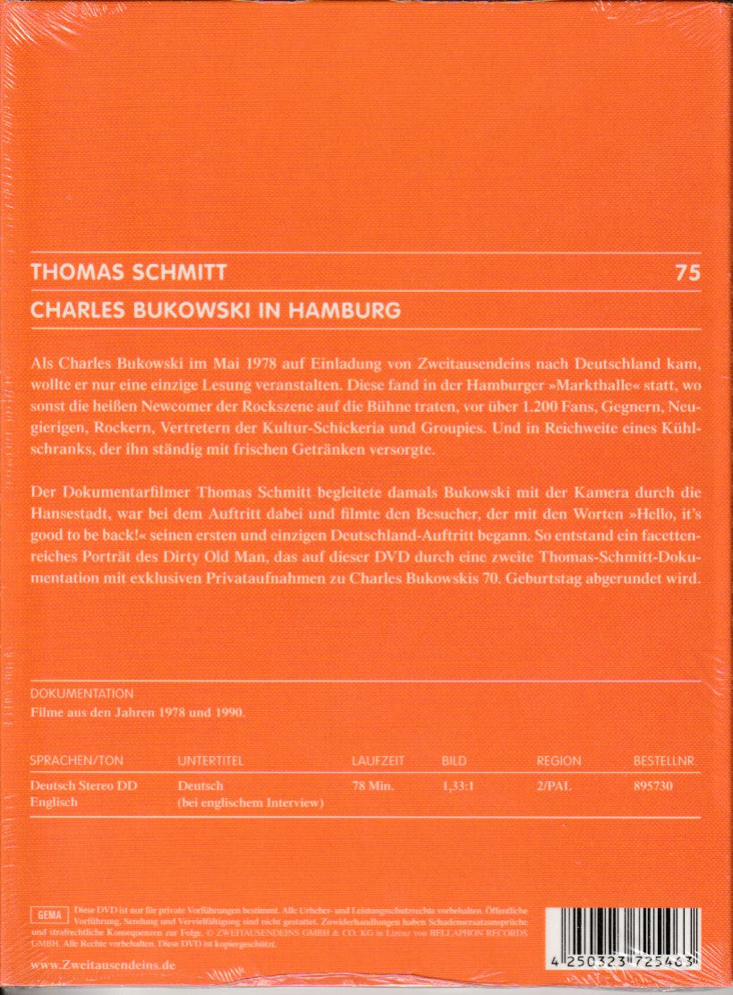 Hello, it's good to be back! When Charles Bukowski came to Germany in May 1978, he only wanted to perform a single reading. This took place in the Hamburg "Markthalle", where otherwise the hot newcomers of the rock scene entered on stage, over 1,200 fans, opponents, curious, rockers, representatives of the culture shickeria and groupies. And within reach of a fridge that constantly supplies him with fresh drinks. The documentary filmer Thomas Schmitt accompanied Bukowski with the camera through the Hanseatic city, was with the appearance and moved the visitor with the words "Hello, it's good to be back!" began its first and only German appearance. This results in a multi-faceted portrait of the Dirty Old Man, which is rounded off on this DVD by a second Thomas Schmitt-documentation with exclusive private recordings of Charles Bukowski's 70th birthday. "It went like a rock concert, the Rolling Stone amazed at the first and only reading Charles Bukowski in Germany. "Good luck that this only reading was recorded in Germany on May 18, 1978. Because there were 1,200 people in the room, a witch cauldro... Above all, the intense and heated reading makes it clear how important the listeners of this literary freak from the USA and how important the literates of the Beat generation the performance, reading was its appearance" (Radio Bremen). R. Thomas Schmitt "The audience in Hamburg was funny. When I present them a poem to laugh, they laugh, but when I proved them a serious, there was strong applause. A truly different culture" (Charles Bukowski). "Bukowski's poems are compressed short stories, and they always act of a moment of truth" (Jörg Fauser). Spr. :D/E Sub: Interview D 78 minutes. FSK 12 PAL Two thousand edition. 2017 DVD