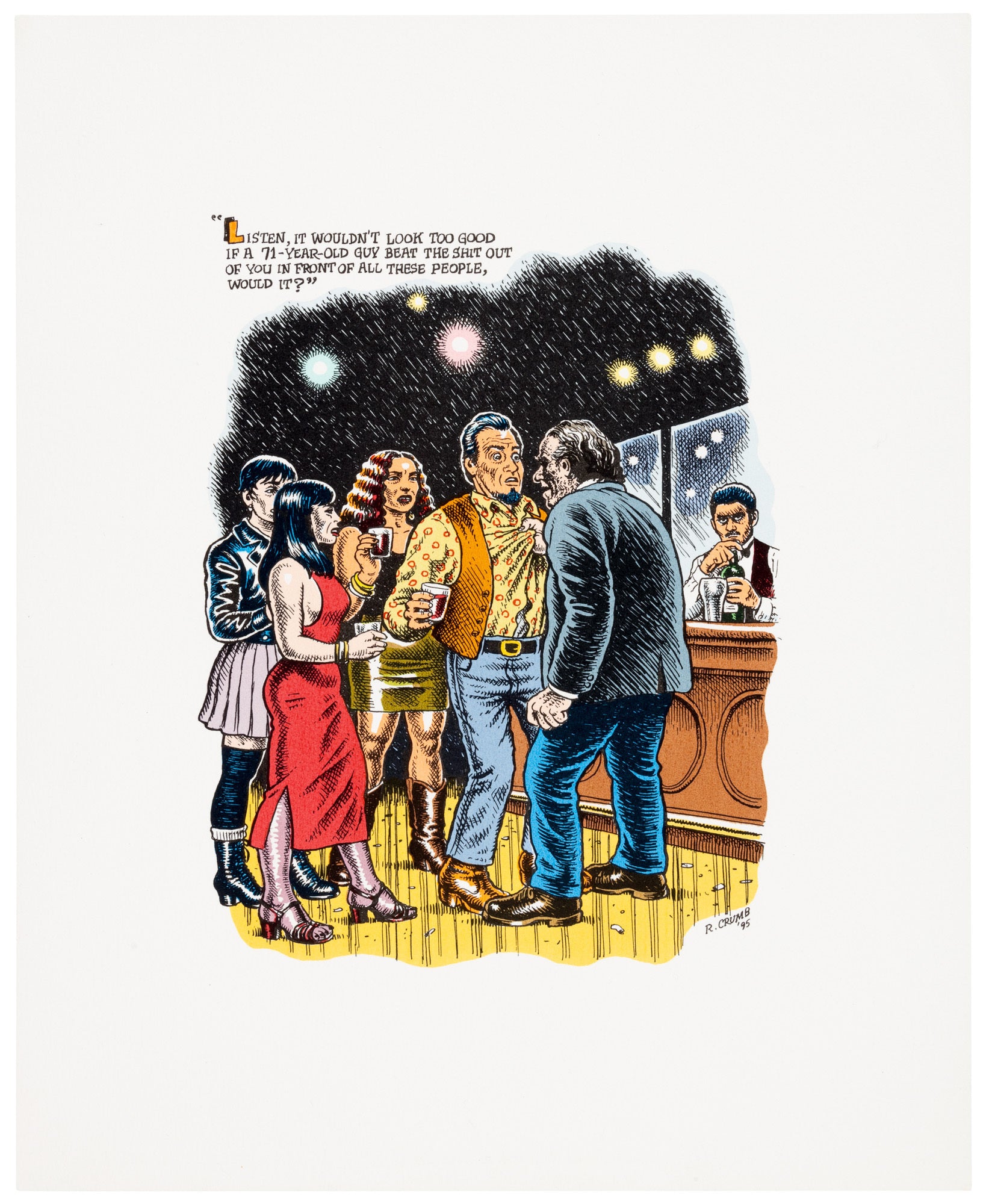 Crumb's drawing captures Bukowski in a scuffle with a younger, larger man at a bar.
