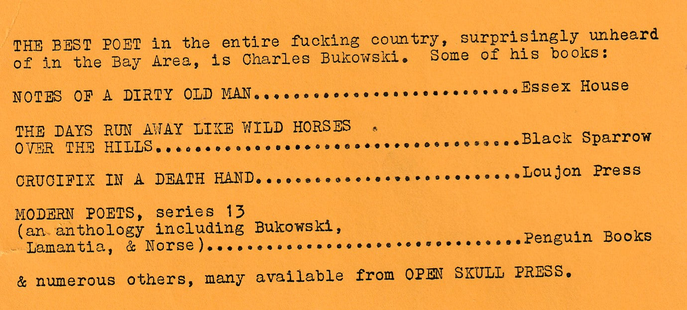 “THE BEST POET in the entire fucking country, surprisingly unheard of in the Bay Area, is Charles Bukowski…”