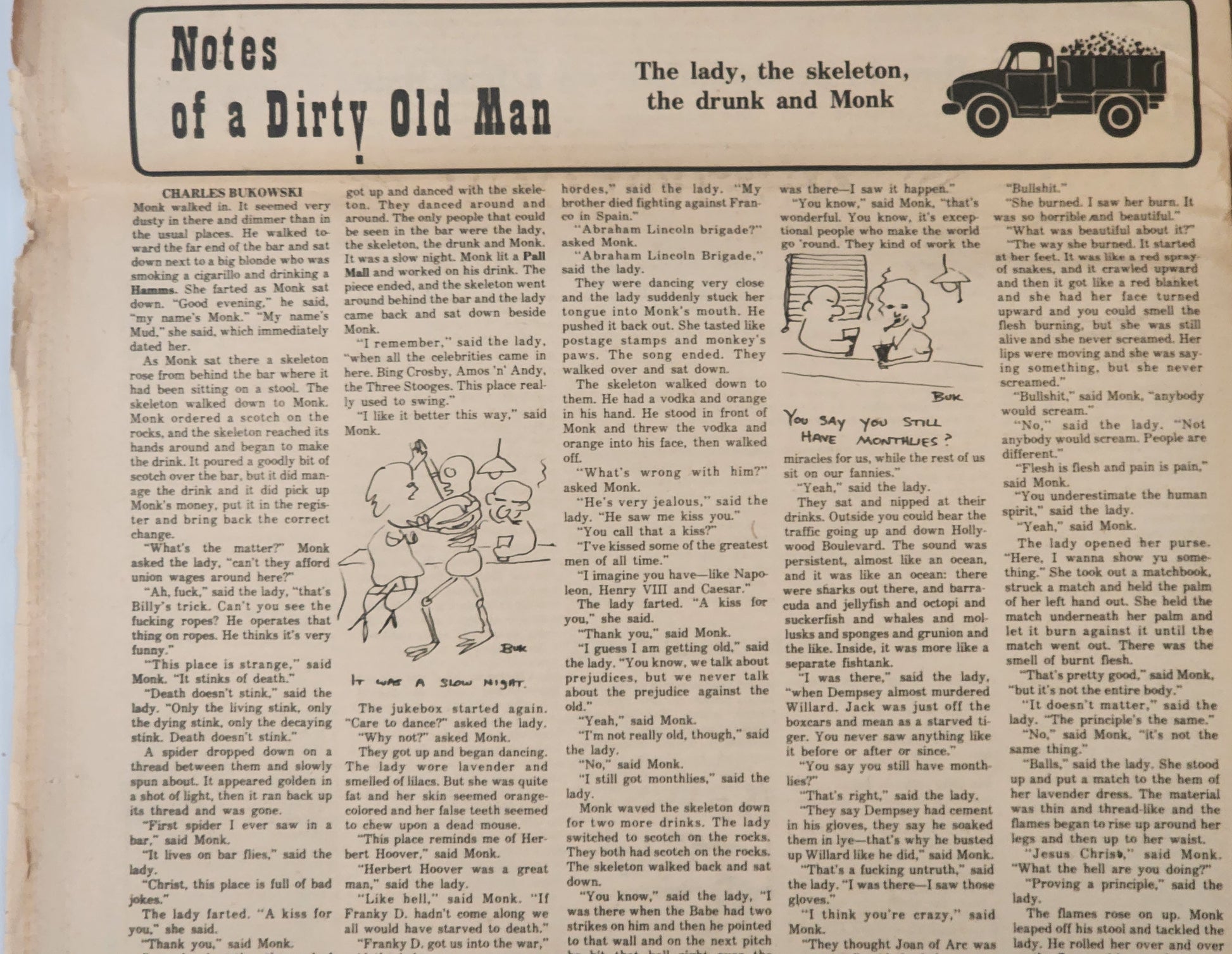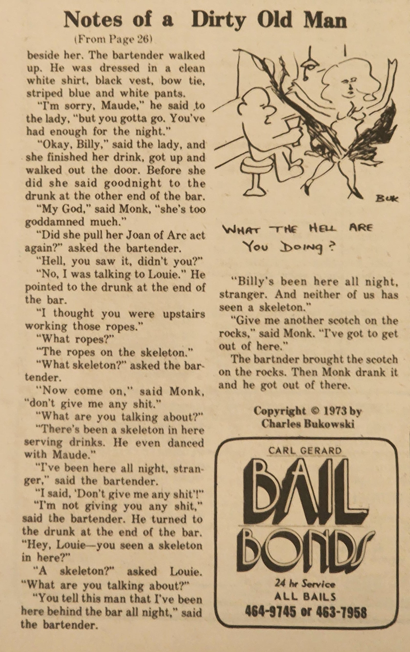 The September 14, 1973, edition of The World Weekly News of Los Angeles featured a Bukowski “Notes of a Dirty Old Man” column about a surreal night at the bar. Three Bukowski drawings related to the story accompany the column.