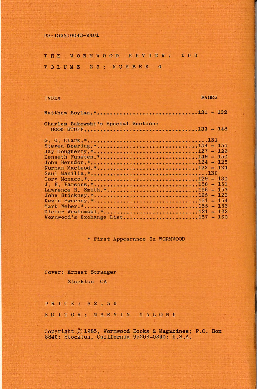 Charles Bukowski always felt Wormwood Review was the best small magazine out there and was grateful that they were one of the first to recognize his work. In return, Bukowski continued to contribute to the magazine right up until his death in 1994.