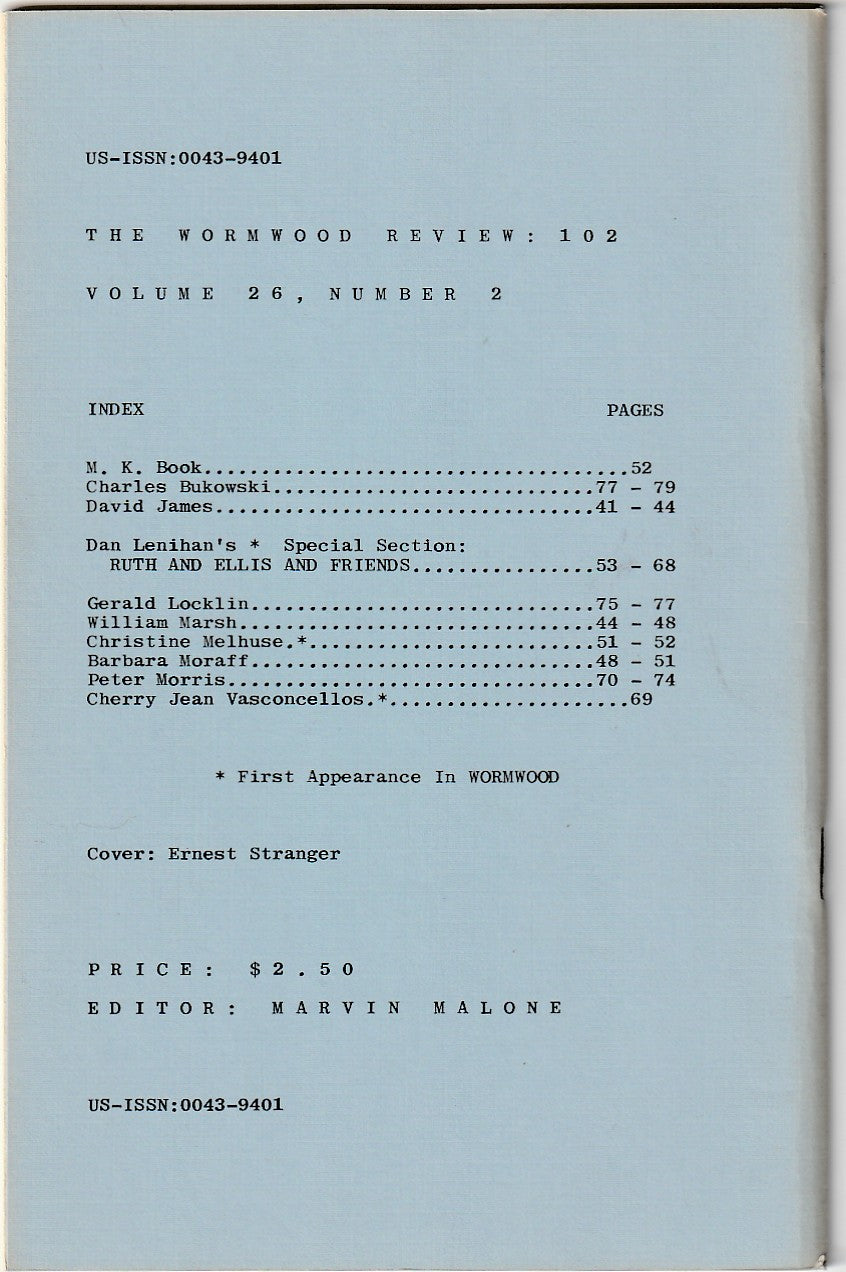 Charles Bukowski always felt Wormwood Review was the best small magazine out there and was grateful that they were one of the first to recognize his work. In return, Bukowski continued to contribute to the magazine right up until his death in 1994.