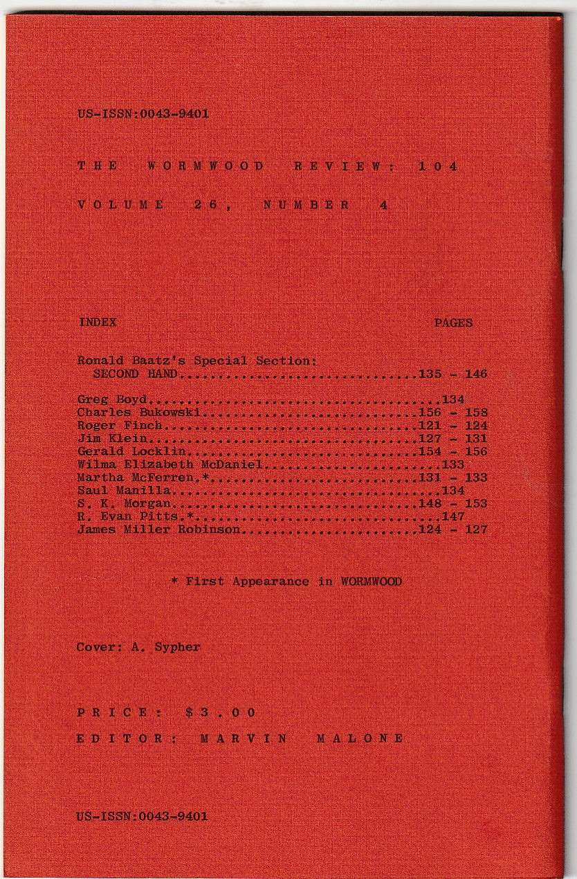 Charles Bukowski always felt Wormwood Review was the best small magazine out there and was grateful that they were one of the first to recognize his work. In return, Bukowski continued to contribute to the magazine right up until his death in 1994.