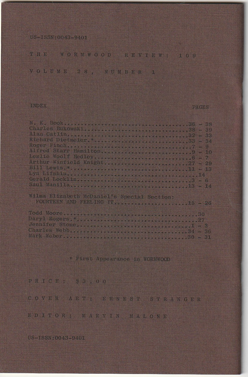 Charles Bukowski always felt Wormwood Review was the best small magazine out there and was grateful that they were one of the first to recognize his work. In return, Bukowski continued to contribute to the magazine right up until his death in 1994.