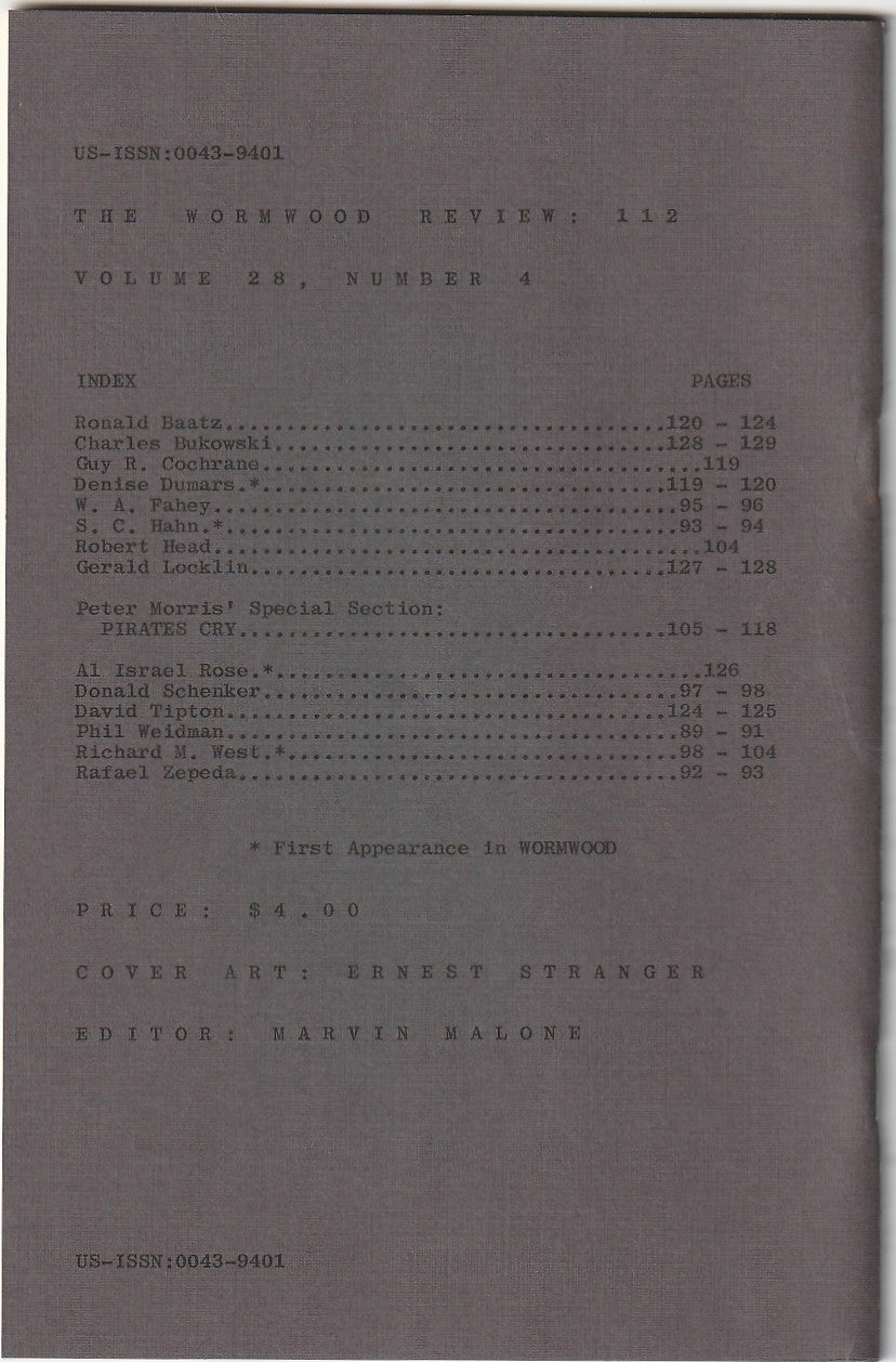 Charles Bukowski always felt Wormwood Review was the best small magazine out there and was grateful that they were one of the first to recognize his work. In return, Bukowski continued to contribute to the magazine right up until his death in 1994.