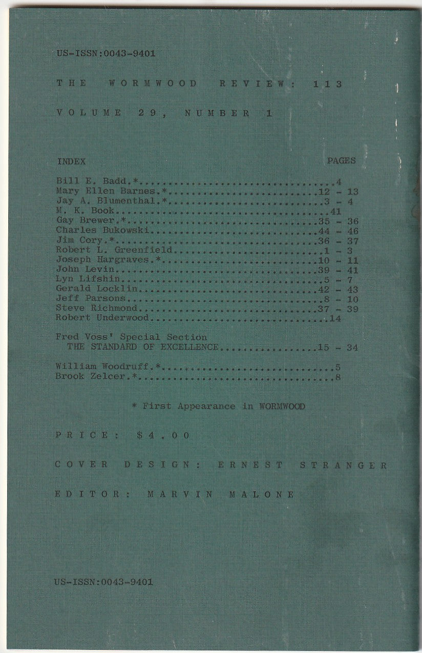 Charles Bukowski always felt Wormwood Review was the best small magazine out there and was grateful that they were one of the first to recognize his work. In return, Bukowski continued to contribute to the magazine right up until his death in 1994.