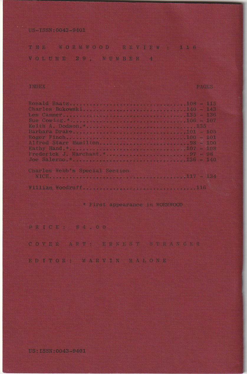 Charles Bukowski always felt Wormwood Review was the best small magazine out there and was grateful that they were one of the first to recognize his work. In return, Bukowski continued to contribute to the magazine right up until his death in 1994.