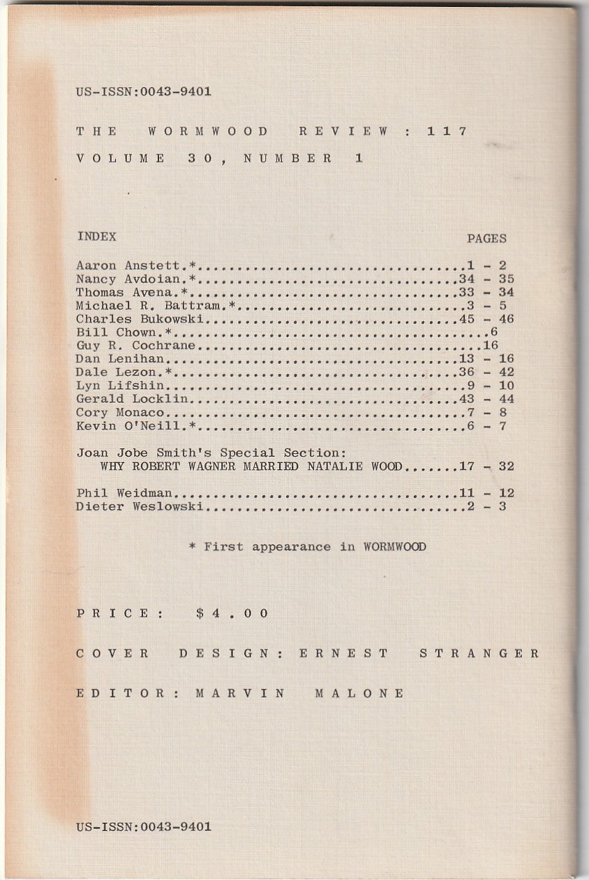 Charles Bukowski always felt Wormwood Review was the best small magazine out there and was grateful that they were one of the first to recognize his work. In return, Bukowski continued to contribute to the magazine right up until his death in 1994.